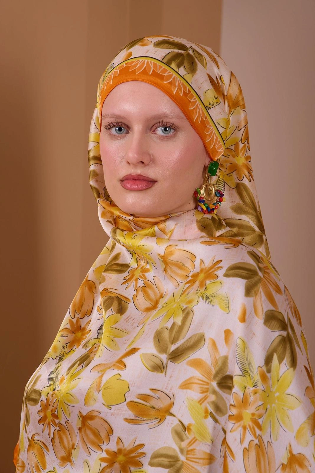 Canlı çiçek desenleri ve ipek dokulu yapısıyla kombinlere enerji katan bu şal, sarı ve turuncu tonlarının sıcak uyumunu yansıtır. Hafif ve dökümlü yapısı sayesinde gün boyu konforlu ve şık bir kullanım sunar.