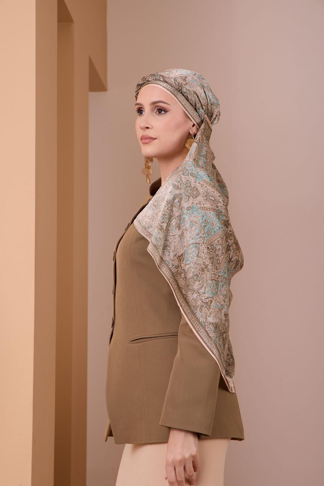 Zarif desenleri ve yumuşak ipek dokulu kumaşıyla şıklığı tamamlayan bu şal, gün boyu konforlu bir kullanım sunar. Bej ve mint tonlarının uyumu sayesinde hem klasik hem modern kombinlerle kolayca uyum sağlar.