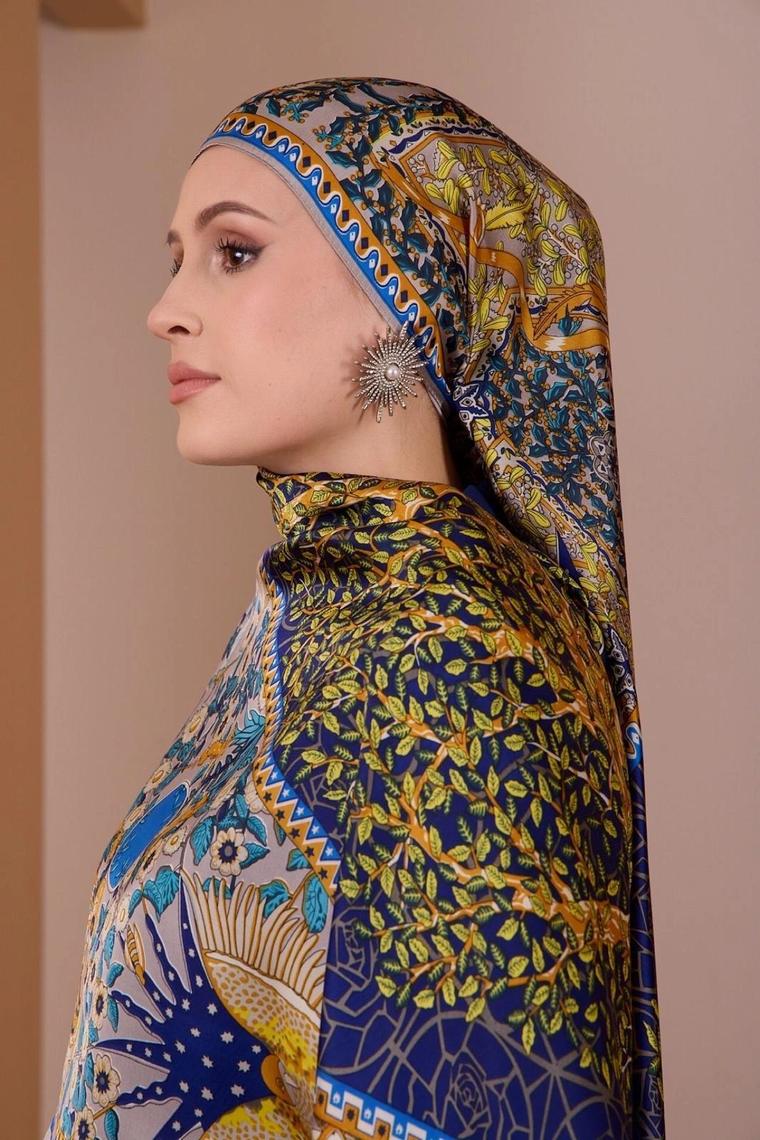Etnik ve doğadan ilham alan desenleriyle öne çıkan bu ipek dokulu şal, lacivert zemin üzerinde hardal ve yeşil tonlarının güçlü uyumunu sunar. Akıcı yapısı sayesinde zarif bir duruş sağlarken kombinlere karakter katar.