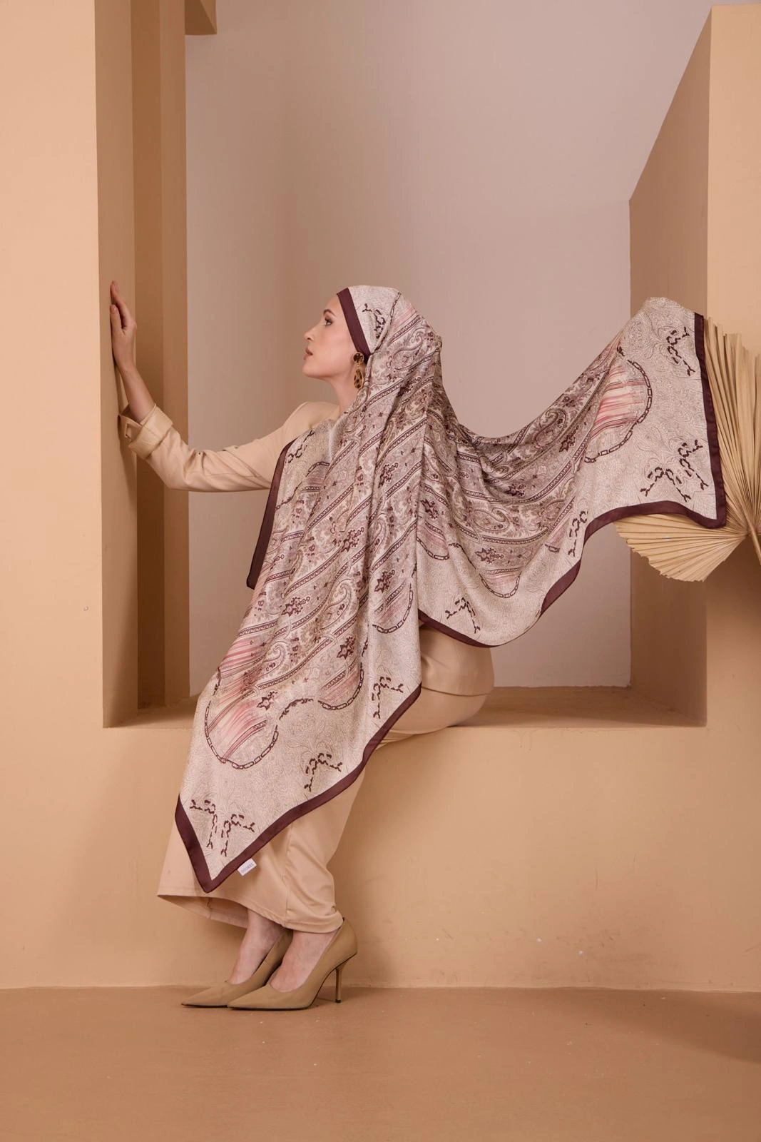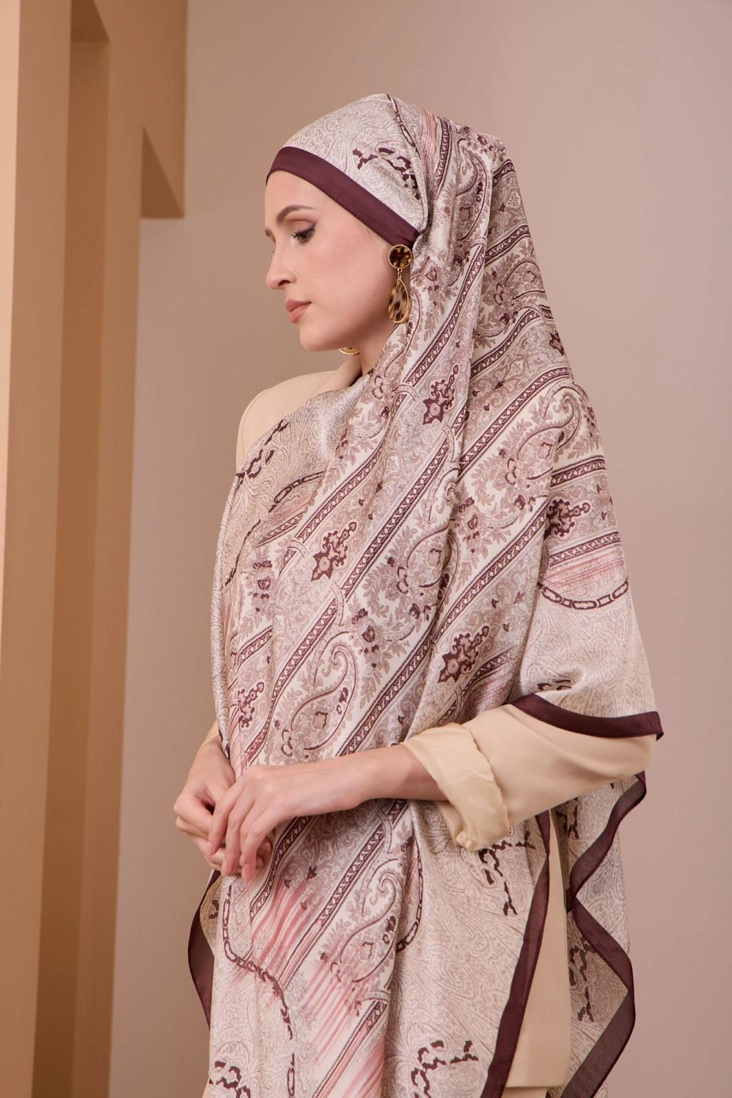Zarif etnik desenleri ve bordo çerçeve detayıyla öne çıkan bu şal, klasik ve modern tarzı bir araya getirir. Yumuşak dokusu sayesinde gün boyu konfor sağlar. Dökümlü yapısı ile farklı bağlama stillerine uygundur; günlük kombinlerden özel davet şıklığına kadar geniş kullanım alanı sunar.
