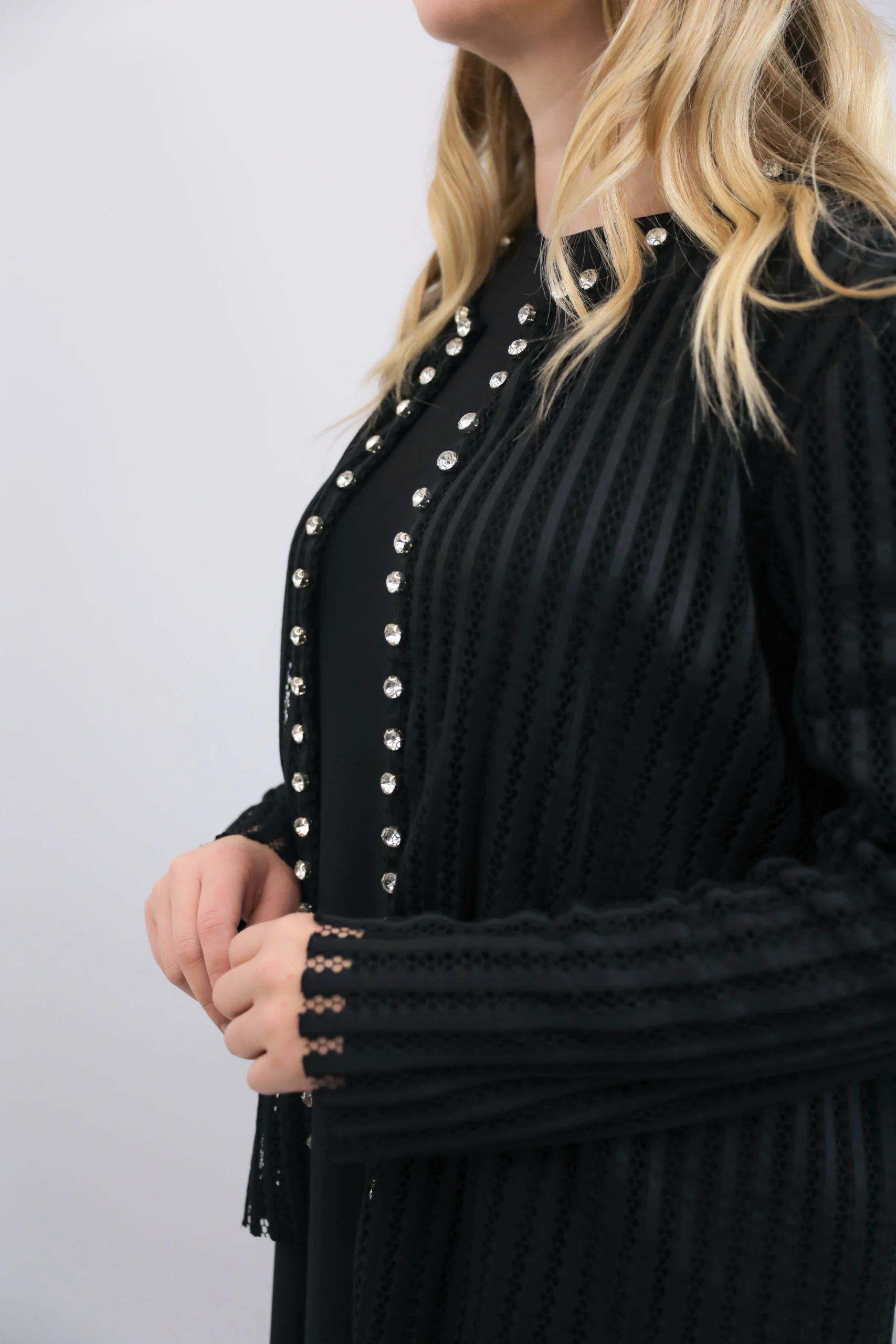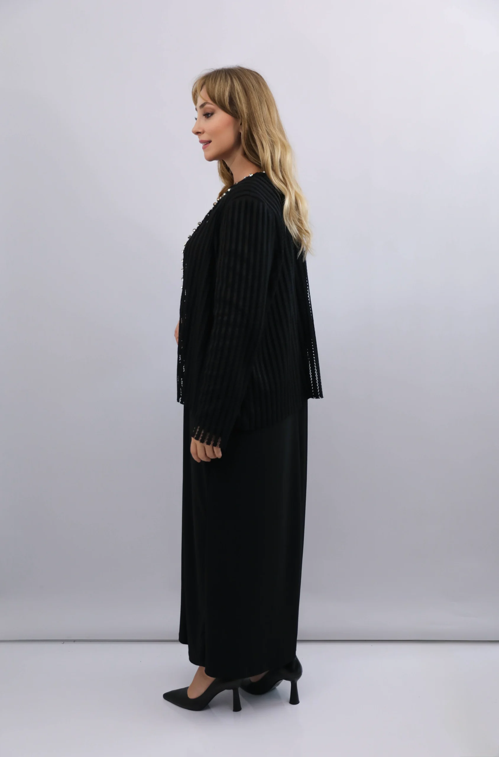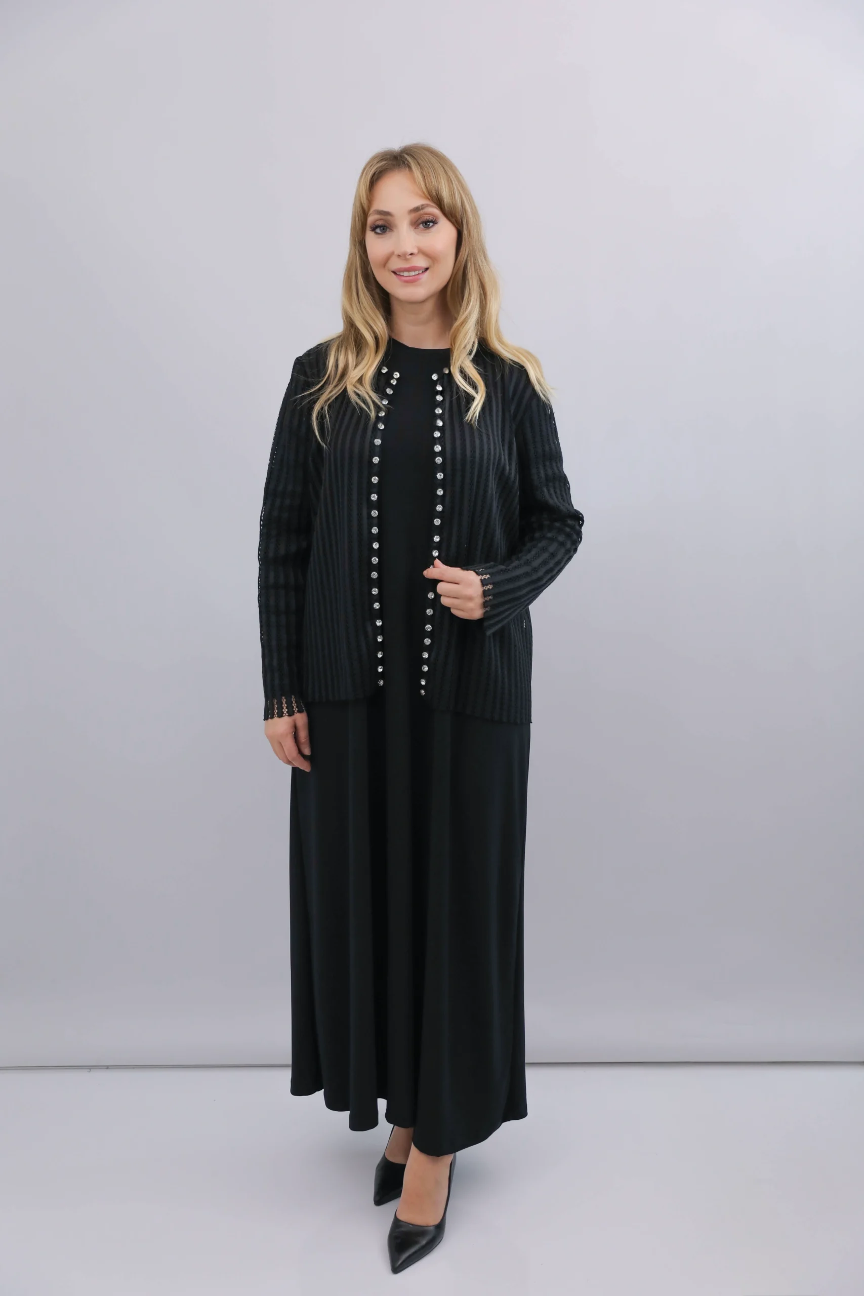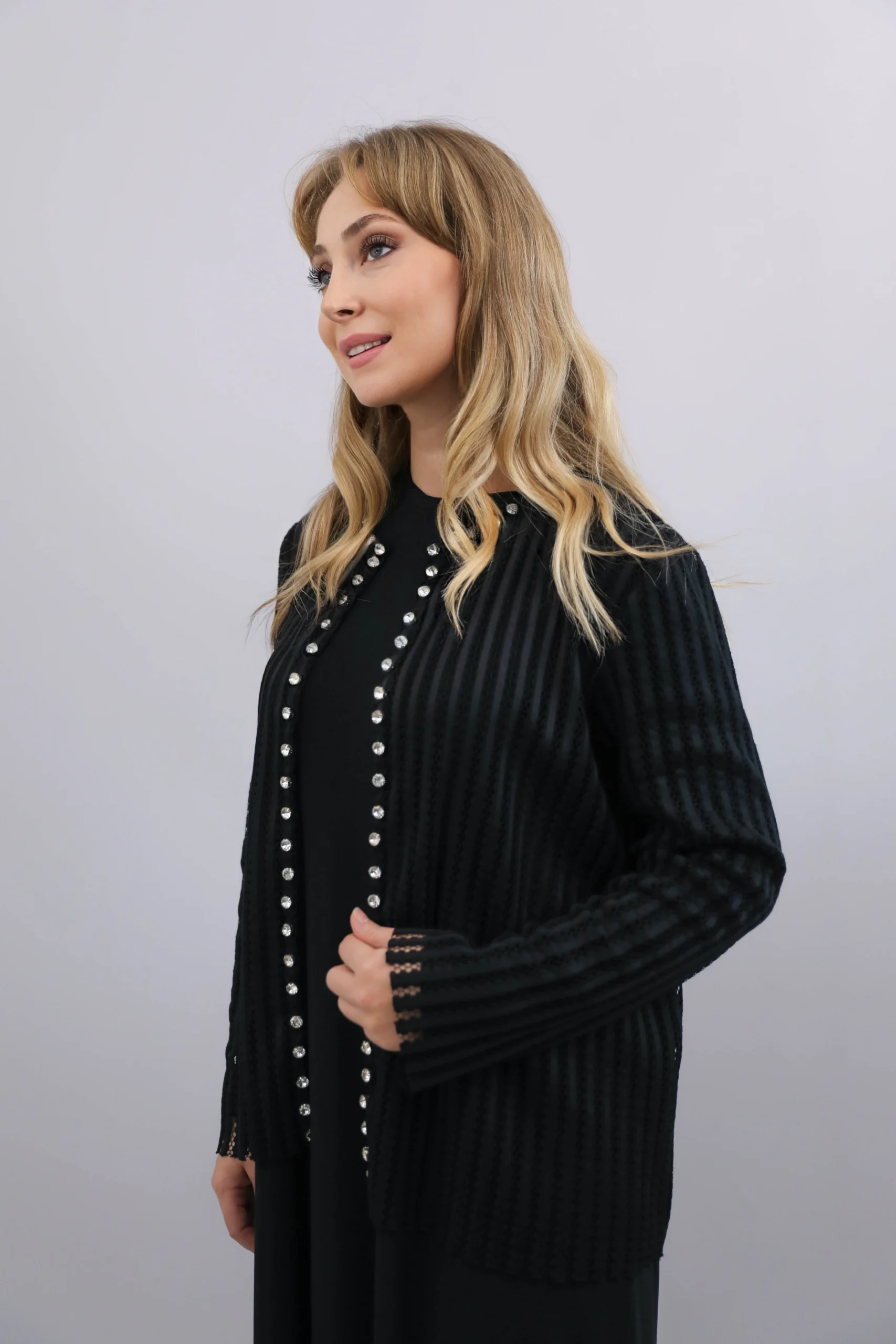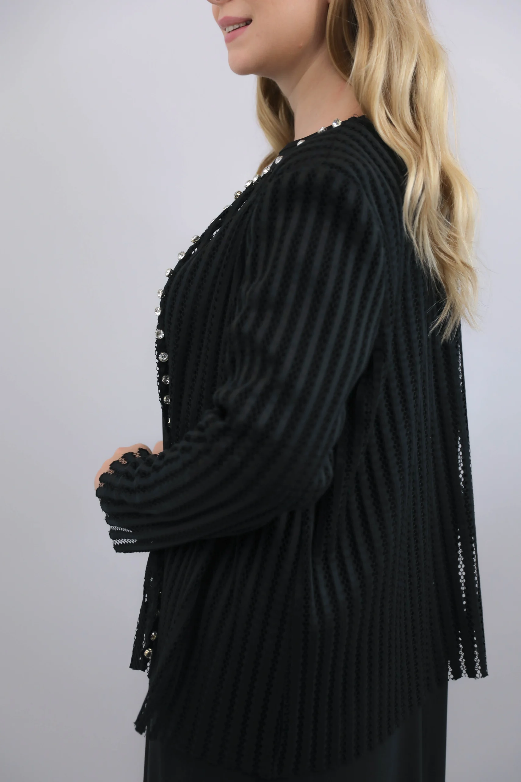 Şık inci düğme işlemeleri ve dokulu kumaşıyla kombinlere zarif bir dokunuş katan siyah hırka modeli.