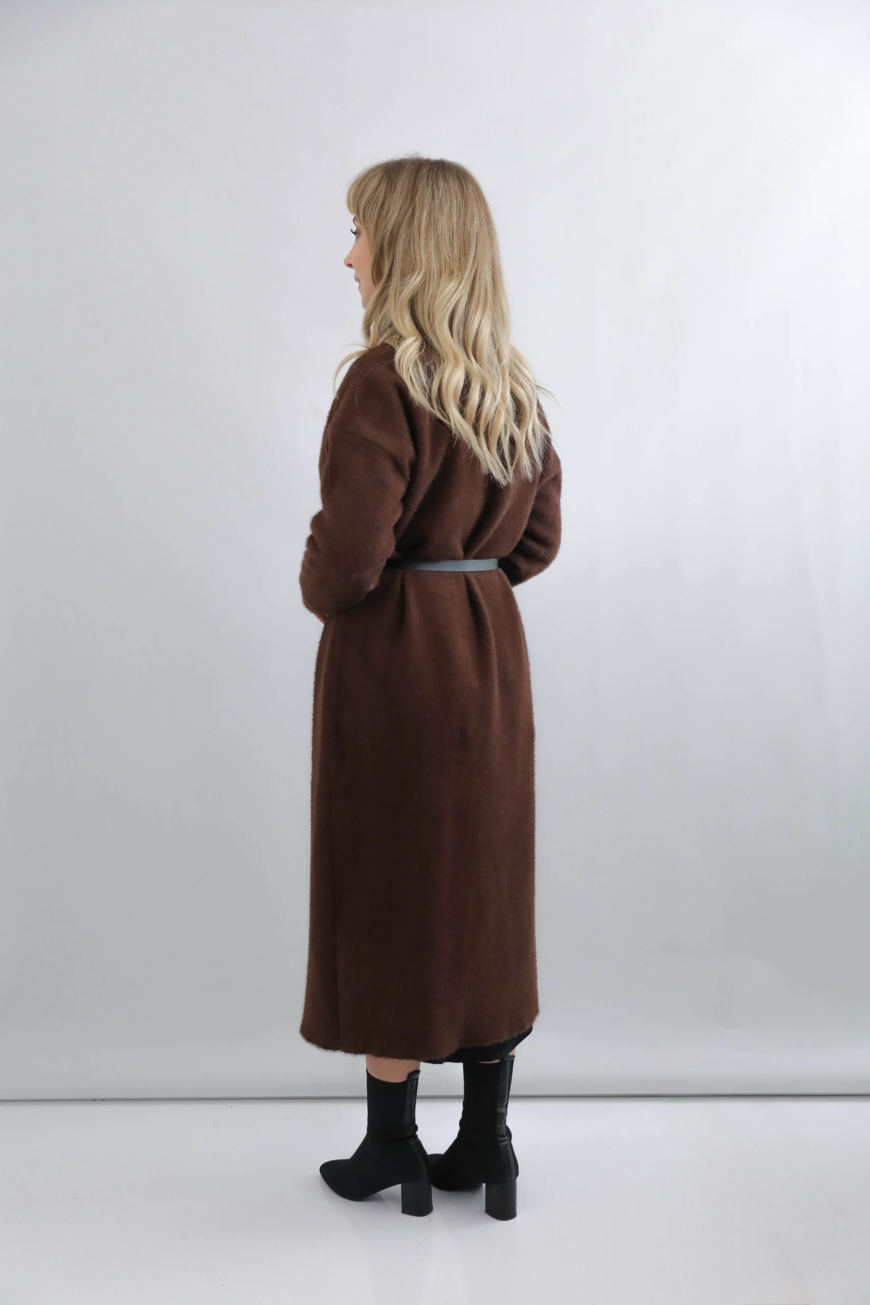 Yumuşak ve sıcak tutan triko dokusu sayesinde hem konforlu hem de şık bir kullanım sunar. Diz altı uzunluğu ve kuşak kemeri ile vücuda oturan hoş bir siluet oluşturur.