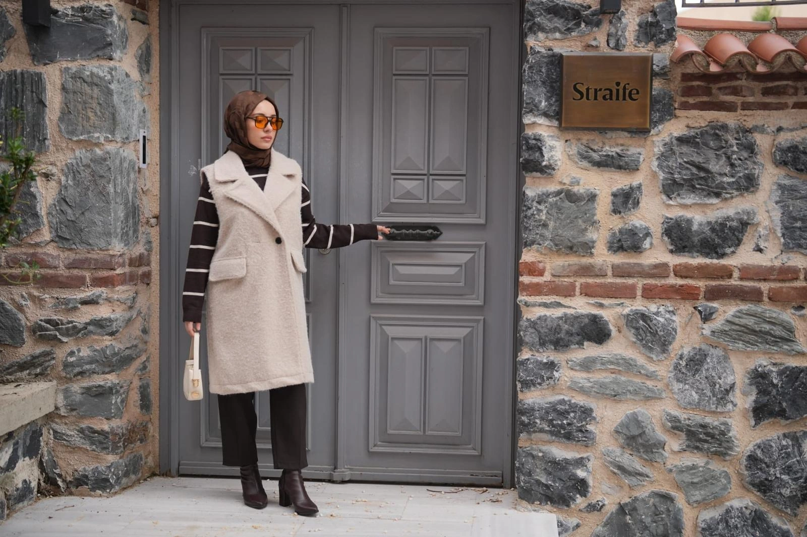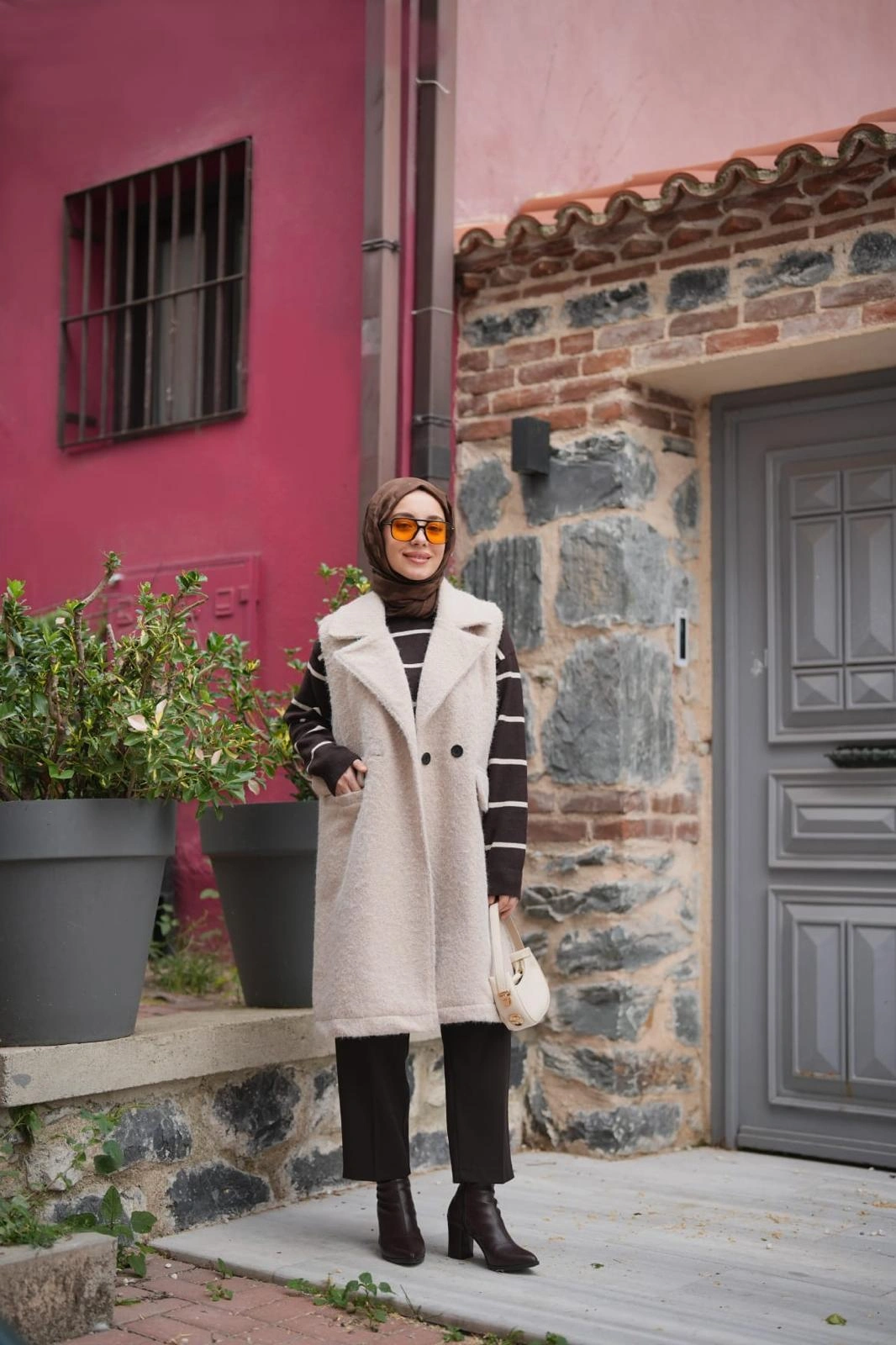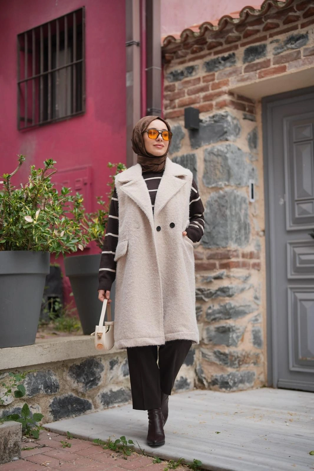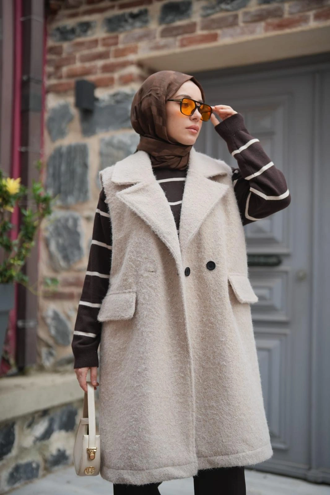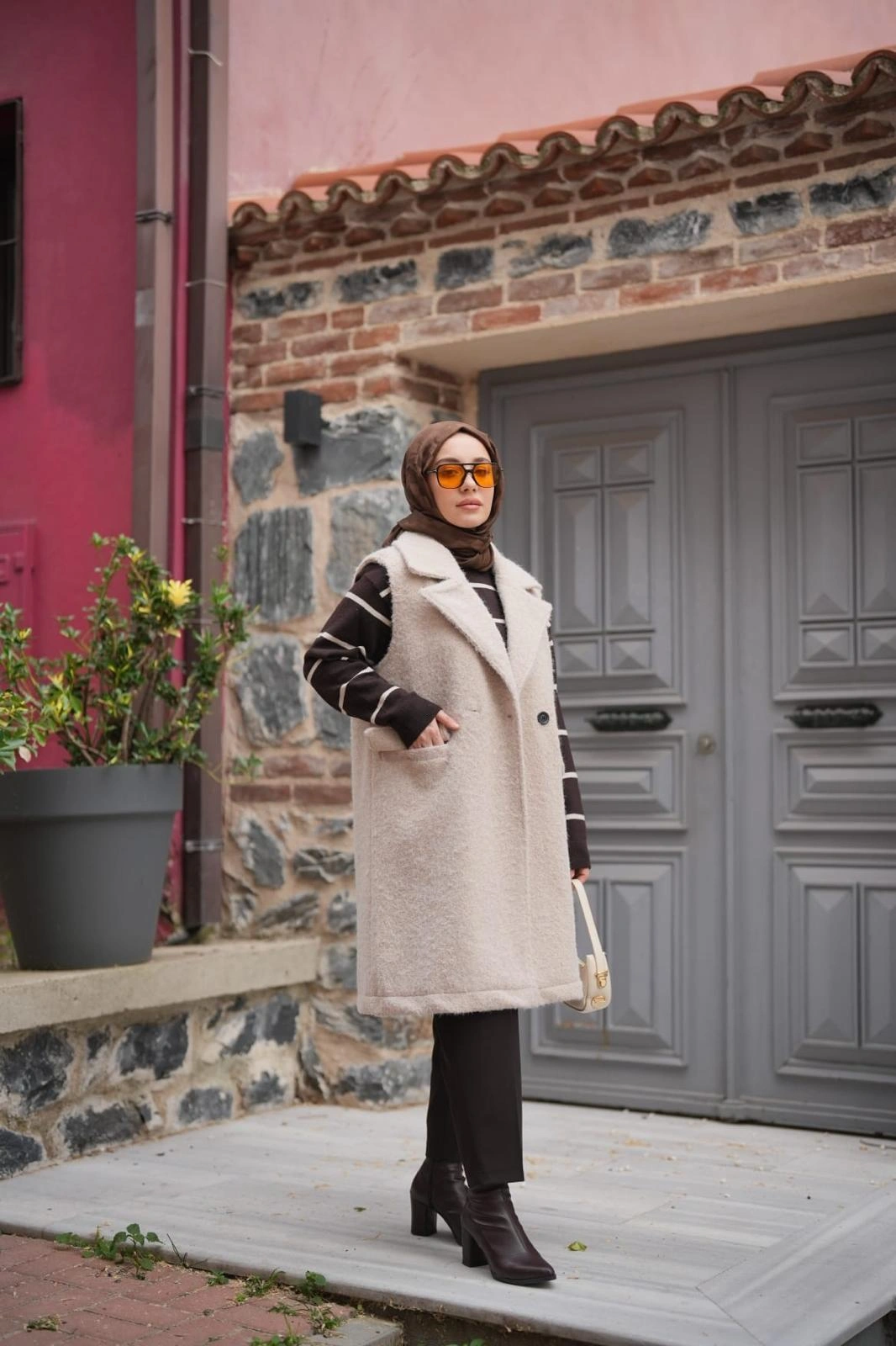 Soğuk havalarda şıklığından ödün vermek istemeyenler için tasarlanan bej kolsuz teddy yelek, yumuşak dokusu ve modern kesimiyle günlük kombinlerin vazgeçilmezi oluyor.