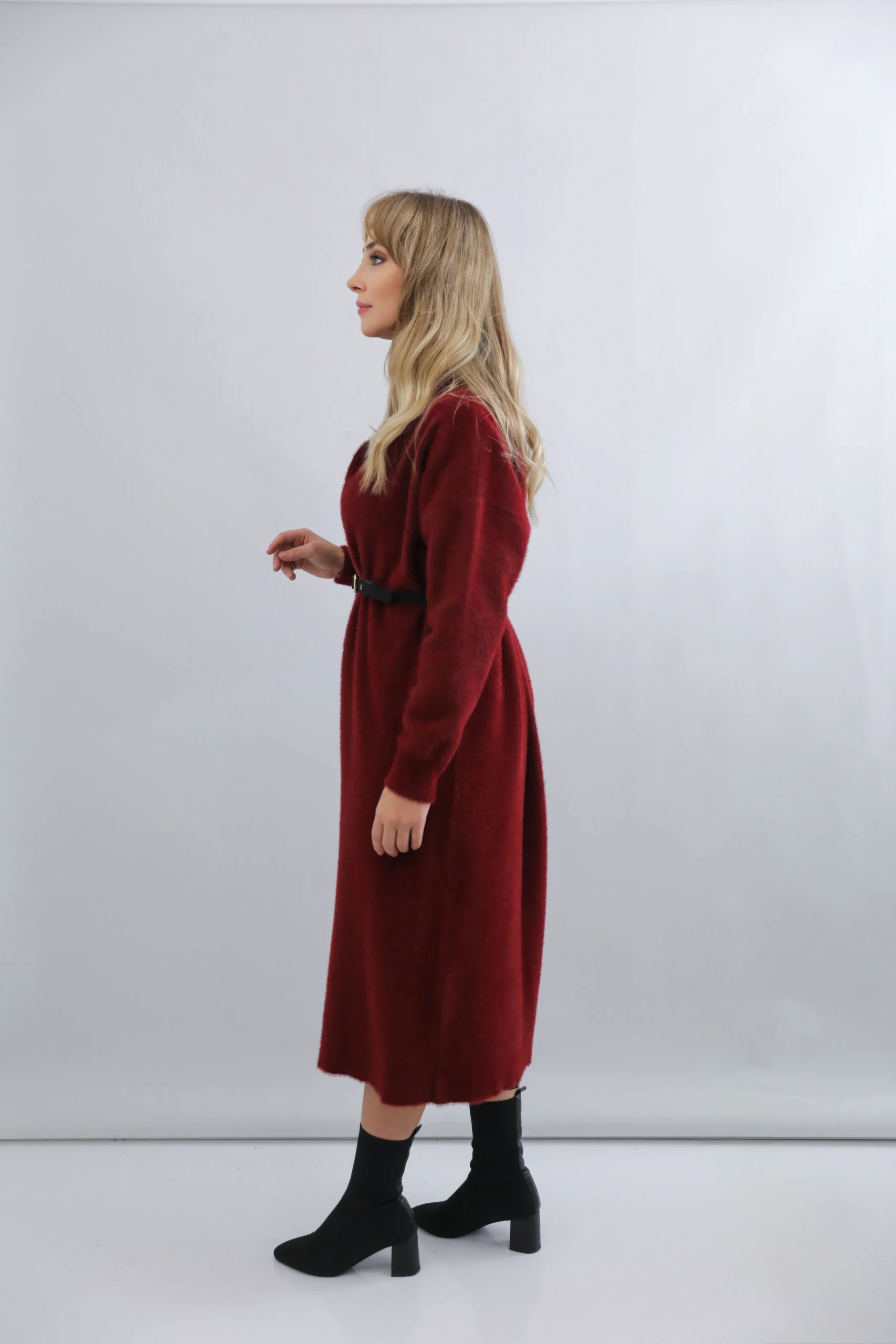 Belden kuşaklı tasarımı, vücut formunu daha zarif gösterirken modern bir silüet oluşturur.