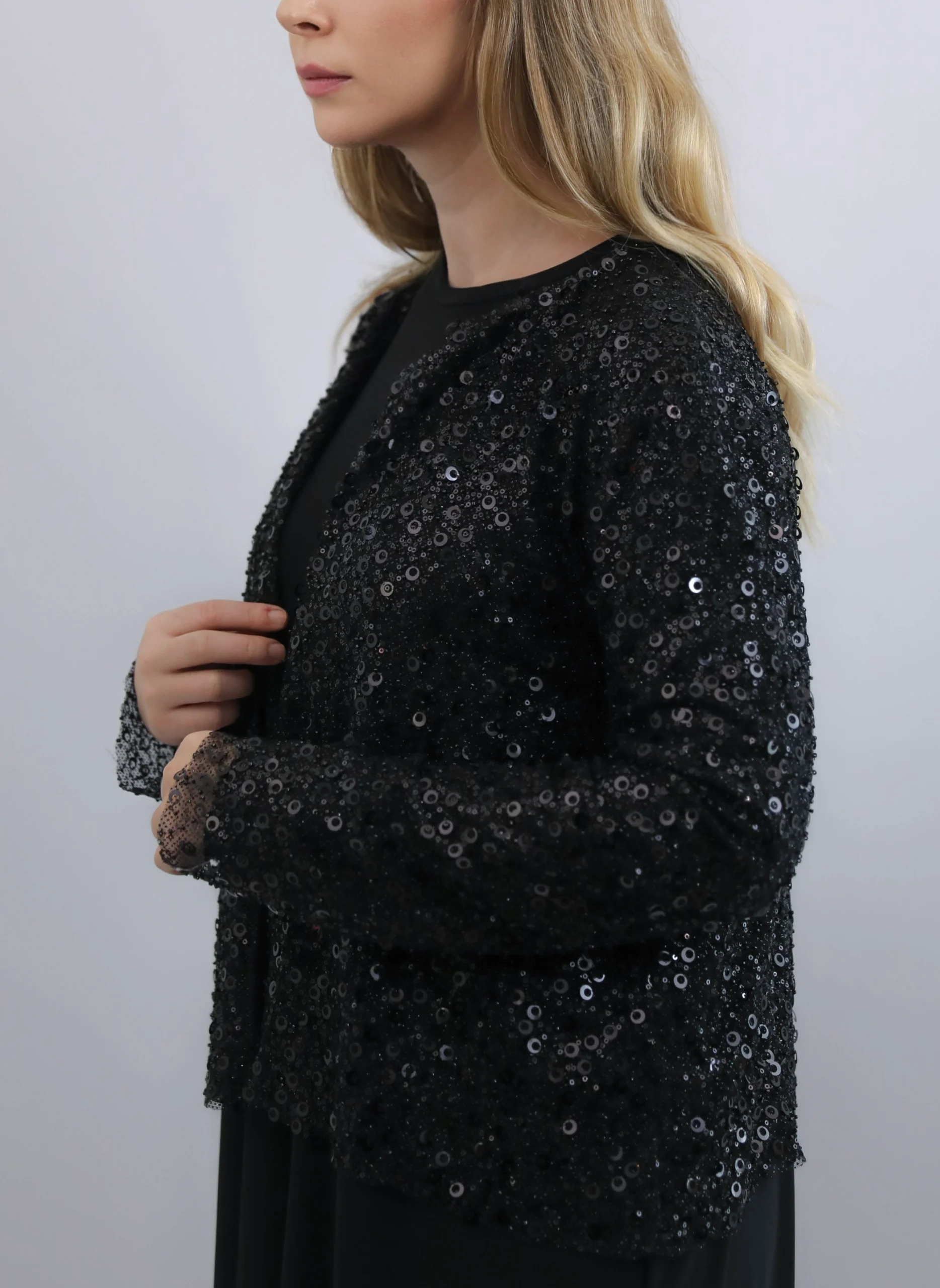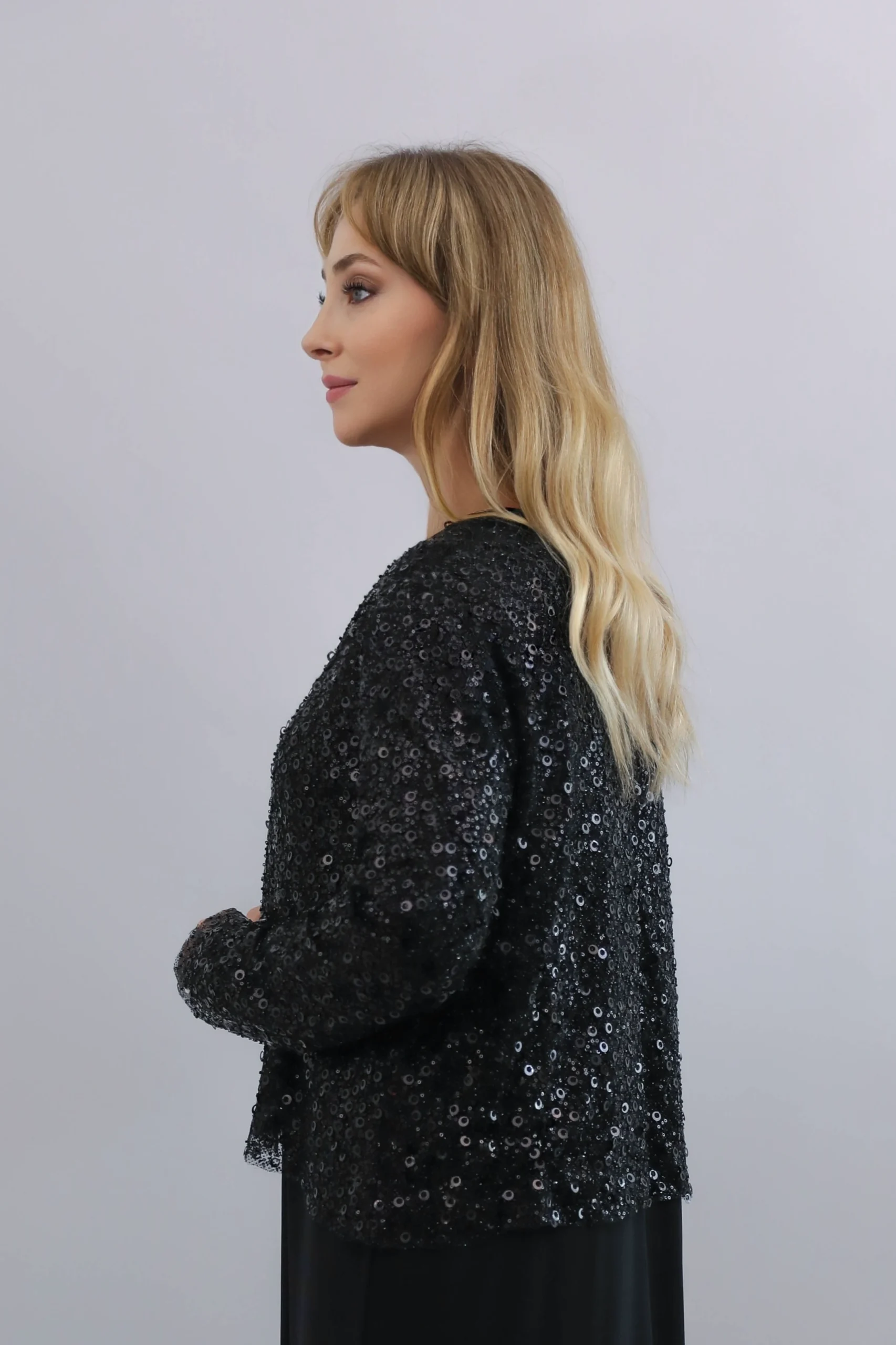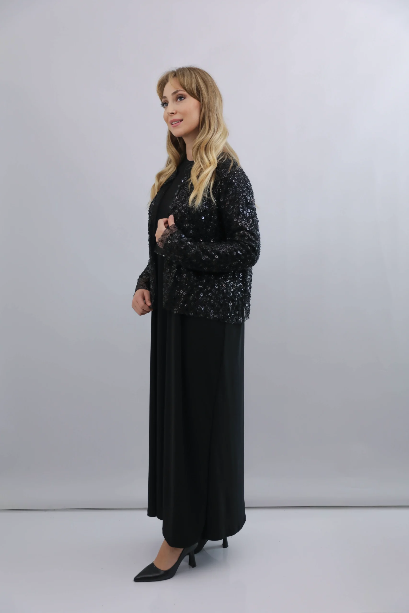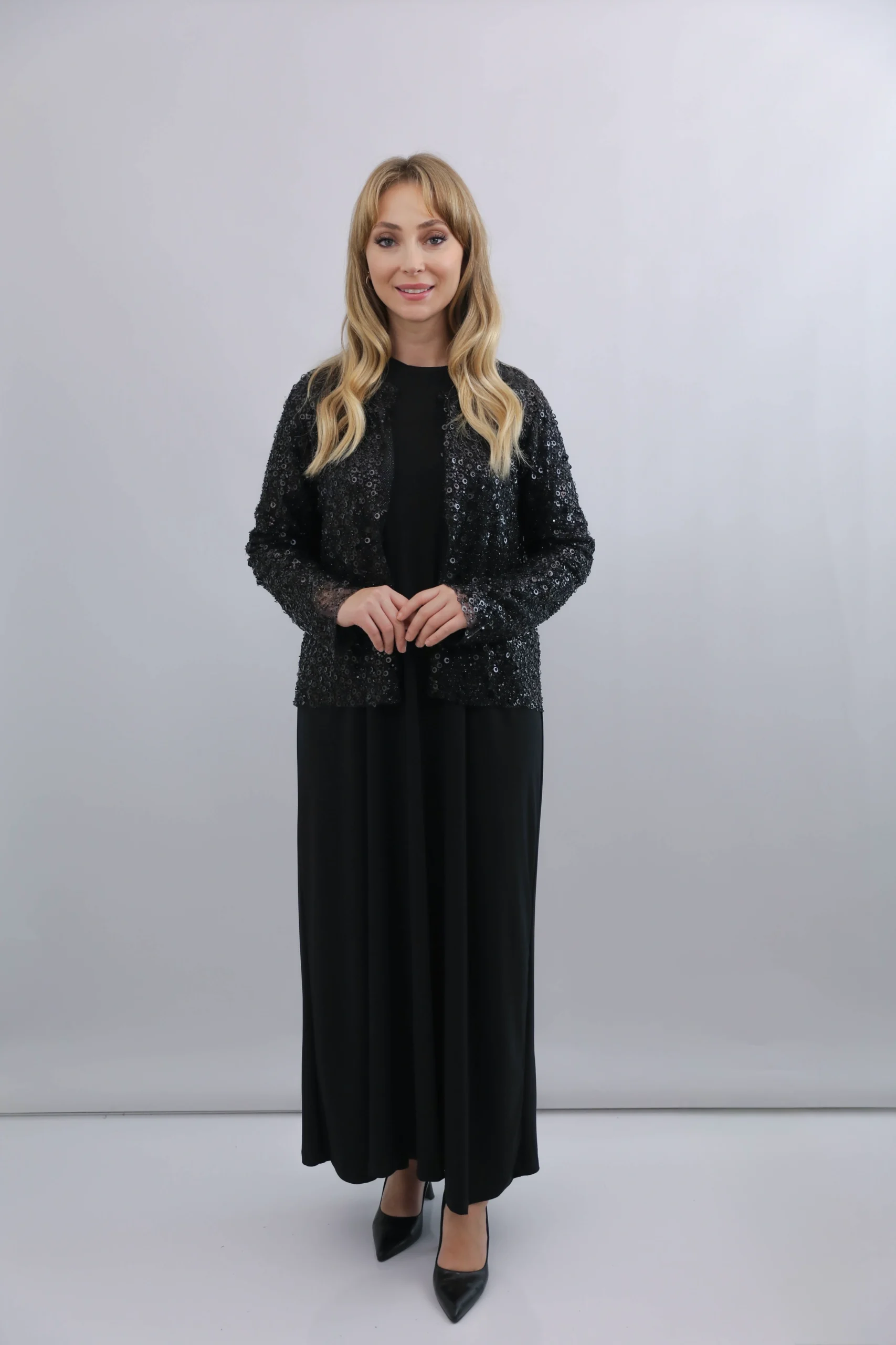 Pul detaylarıyla zenginleştirilmiş bu özel tasarım siyah hırka, modern ve zarif görünümü bir arada sunar. Hafif yapısı sayesinde gün boyu konfor sağlarken, ışıltılı yüzeyi ile özel gün, davet ve akşam kombinlerine kusursuz uyum sağlar. Şık kesimi ve sade duruşu sayesinde hem elbise hem de abaya üzerine rahatlıkla kullanılabilir. Gardırobunuzun en dikkat çekici parçalarından biri olmaya adaydır.