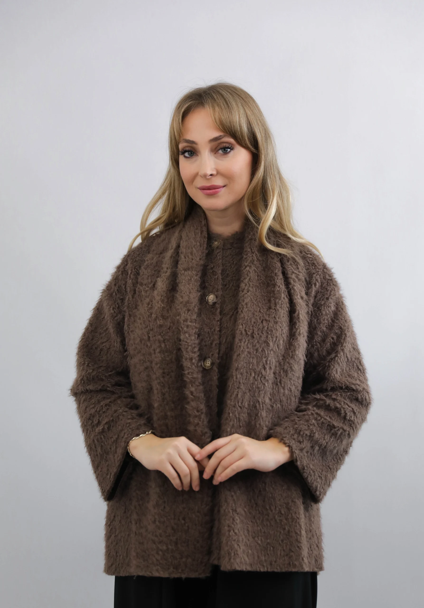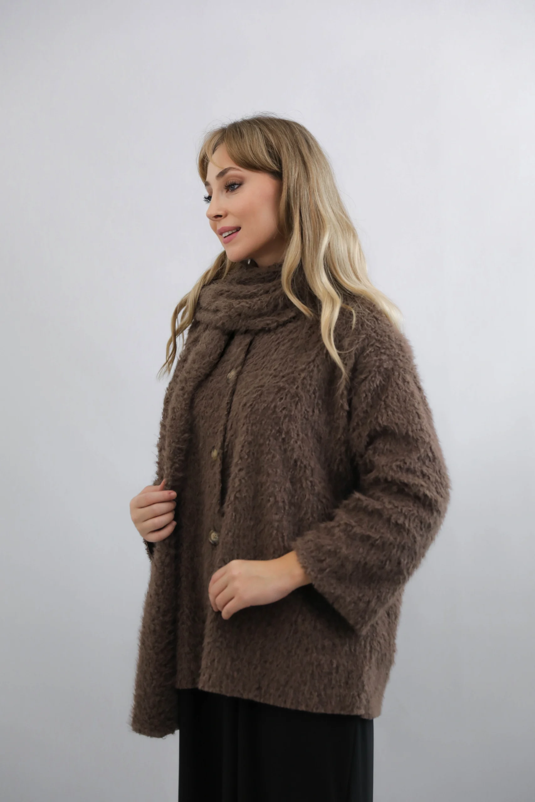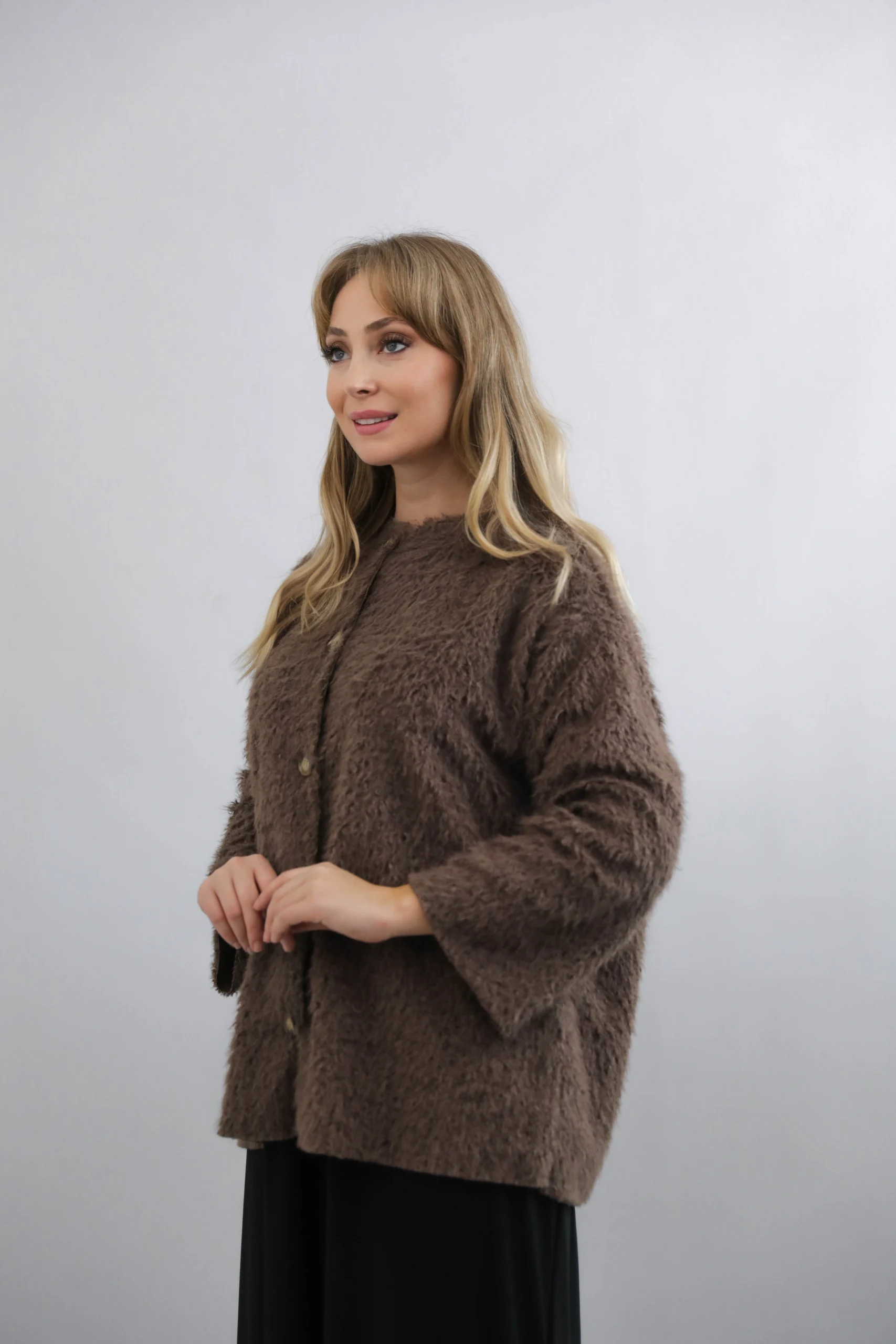 Yumuşacık peluş dokusu, geniş kesimi ve şal yaka detayıyla hem şık hem de sıcak tutan bir modeldir. Düğme kapamalı yapısı ve dökümlü duruşuyla günlük kombinlere rahatlık katar. Soğuk havalarda konforlu ve zarif bir tercih arayanlar için idealdir.