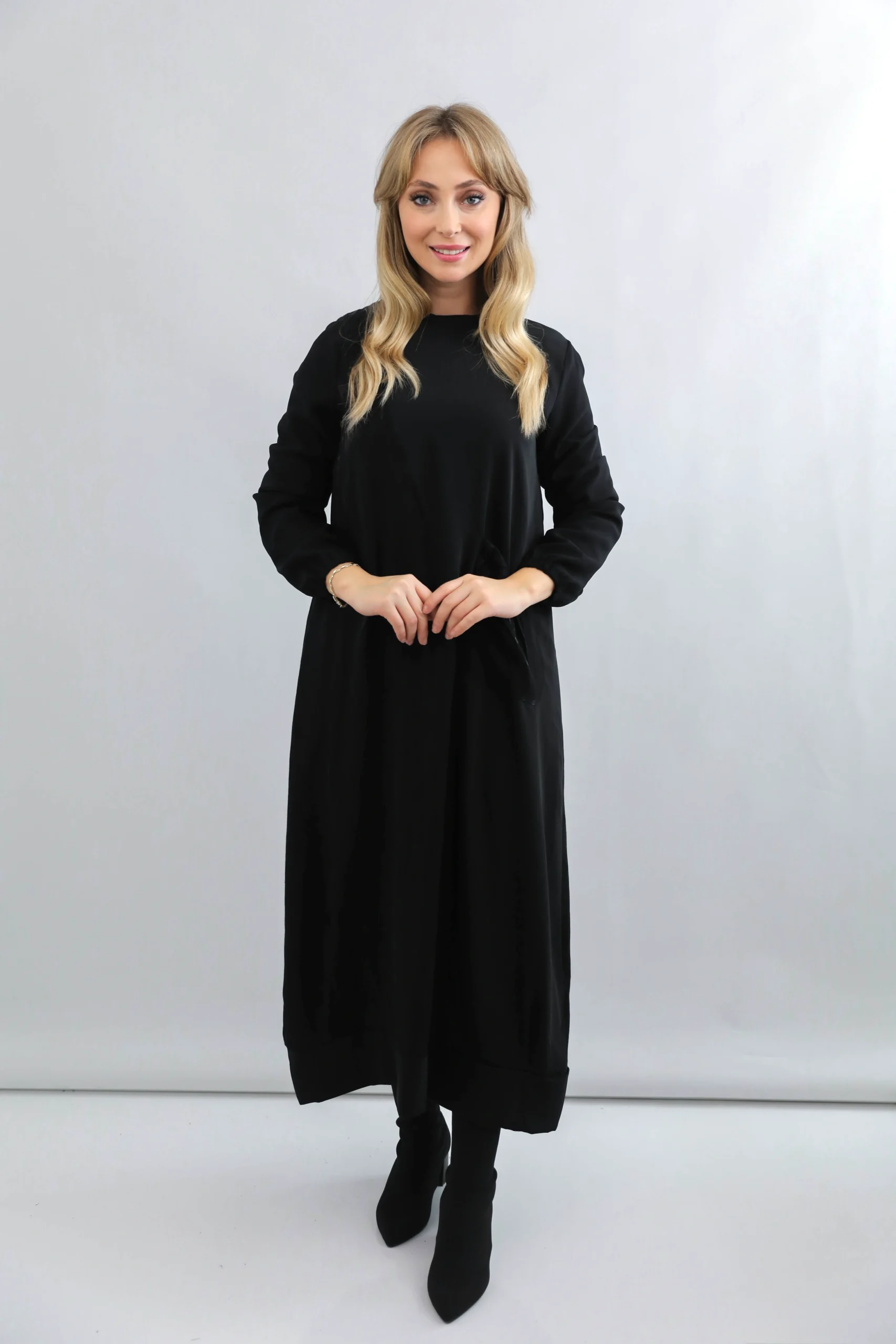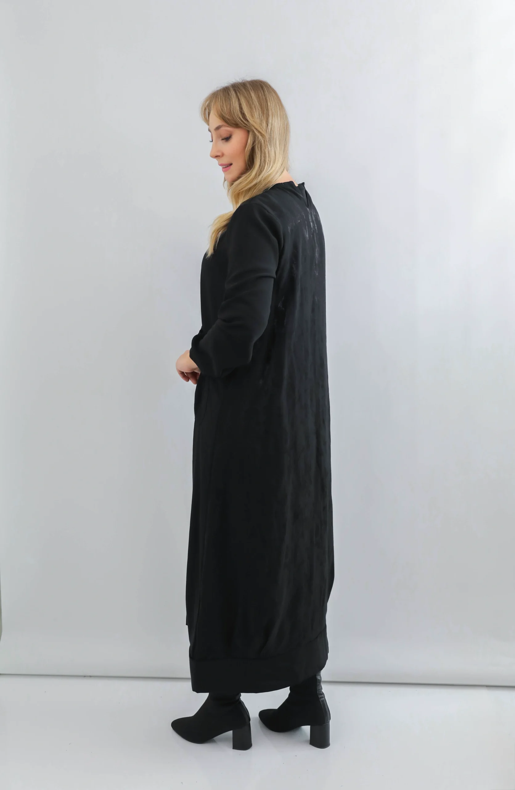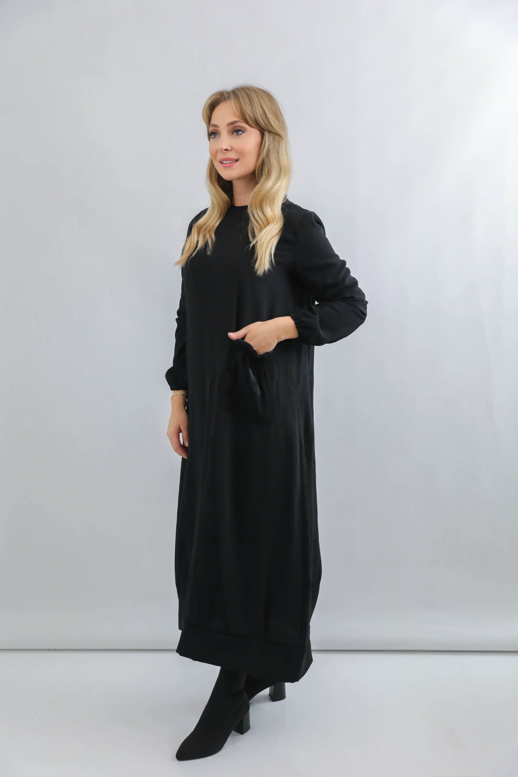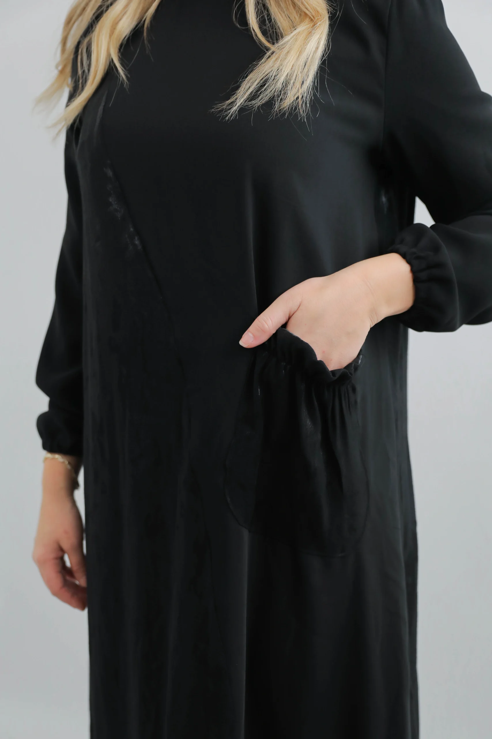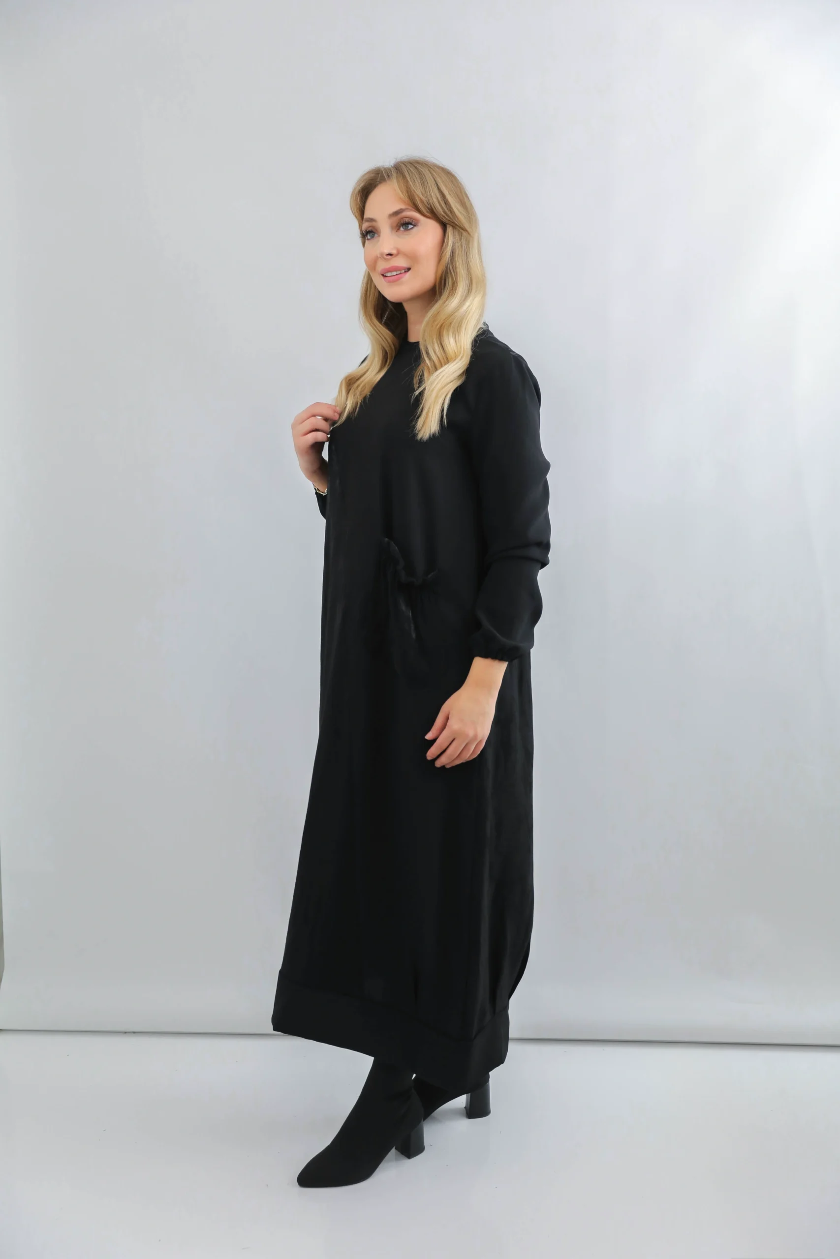 Zarafeti ve konforu bir araya getiren siyah garnili tesettür elbisemiz, gün boyu şıklığına önem veren kadınlar için özel olarak tasarlandı. Mat ve hafif parlak dokulu kumaş geçişleri elbiseye modern bir hava katarken, rahat kesimi ile hem günlük hem özel davetlerde kullanıma uygundur.