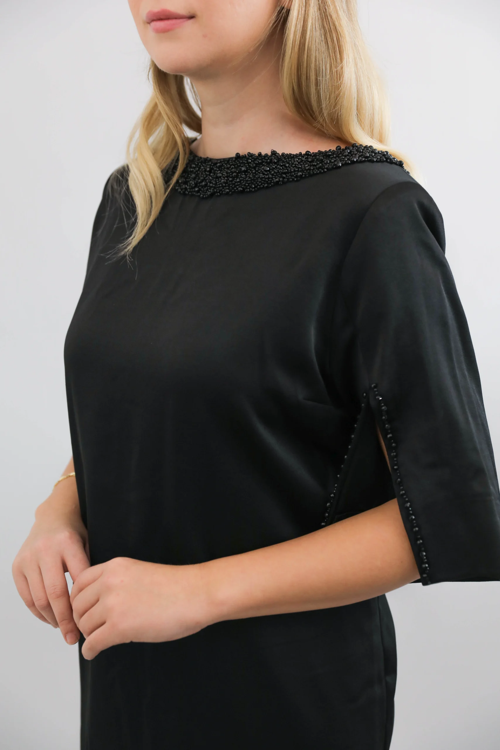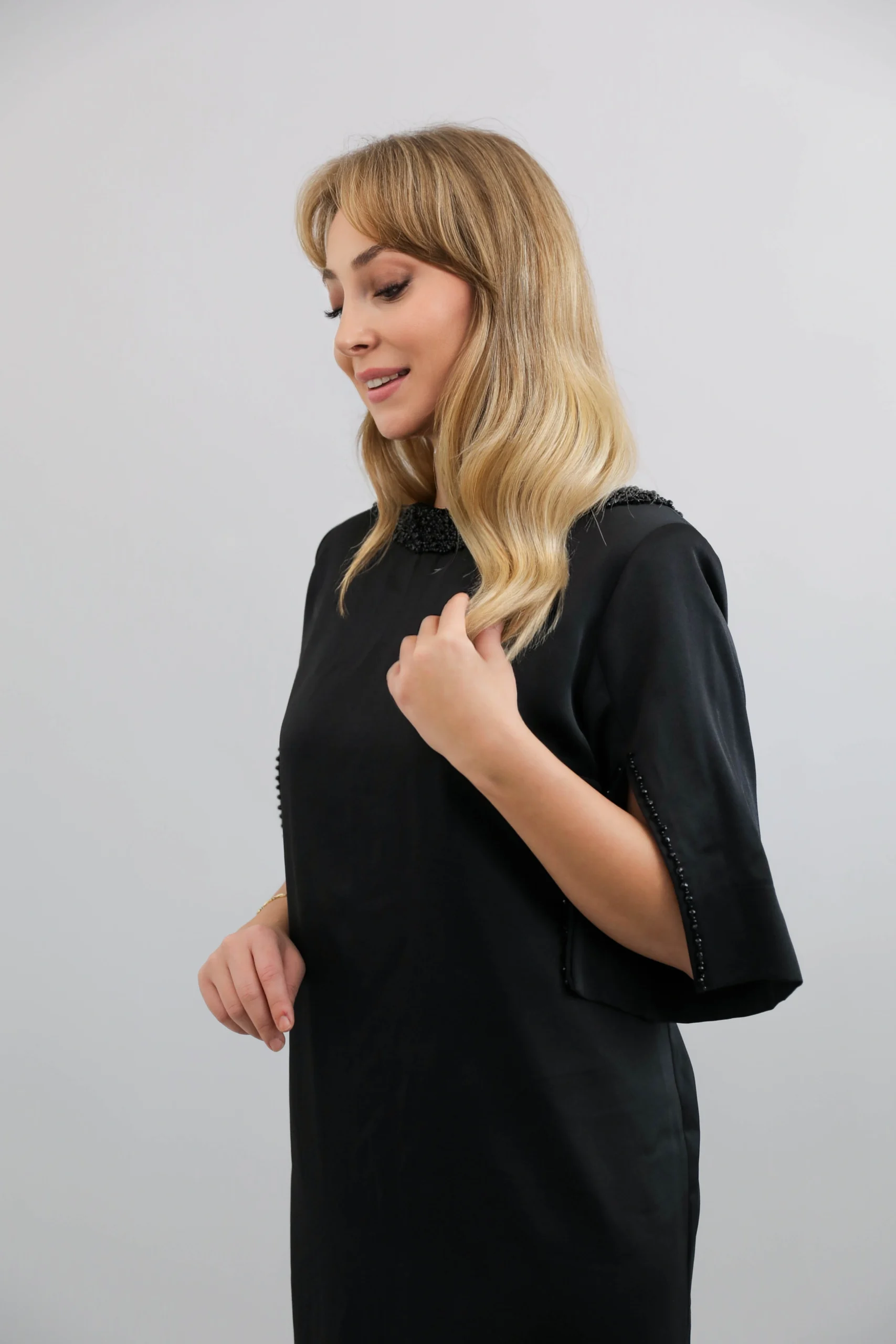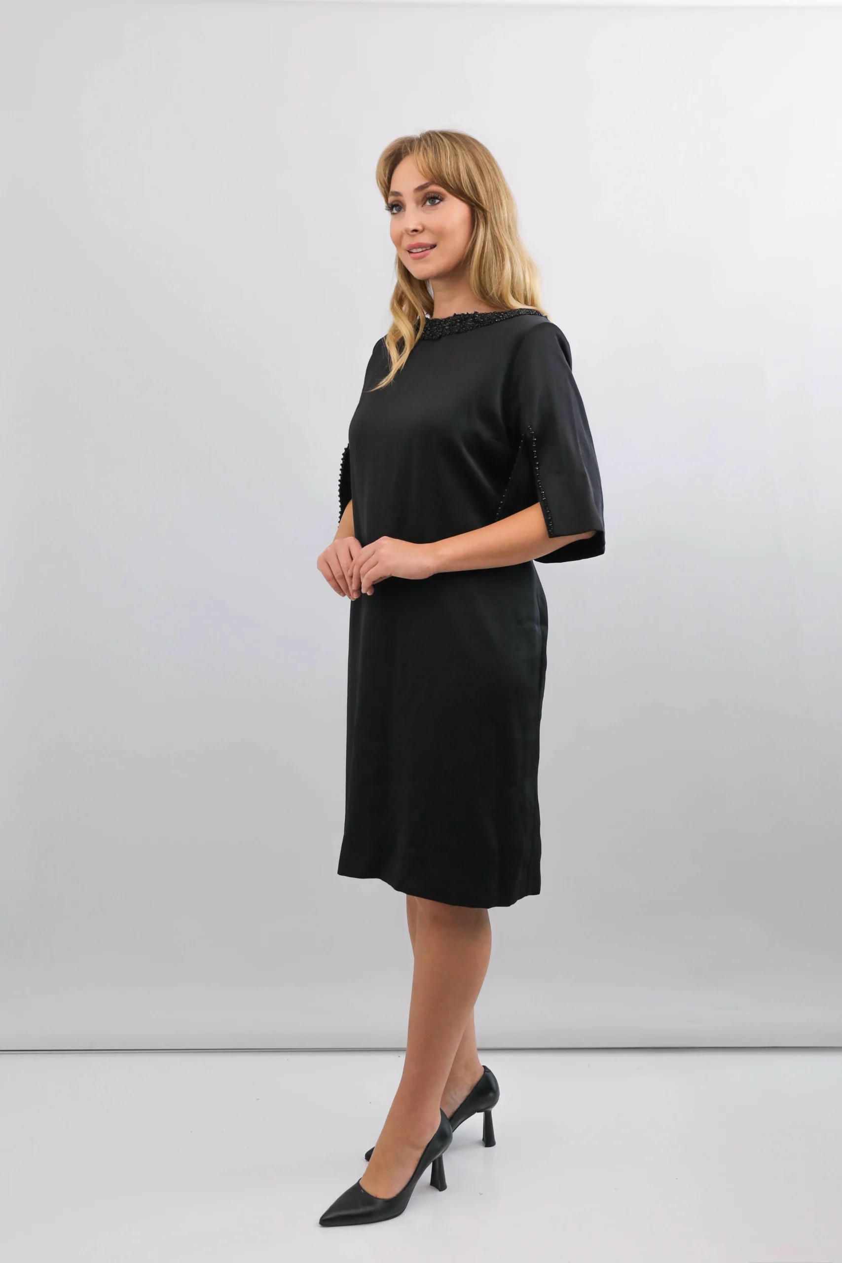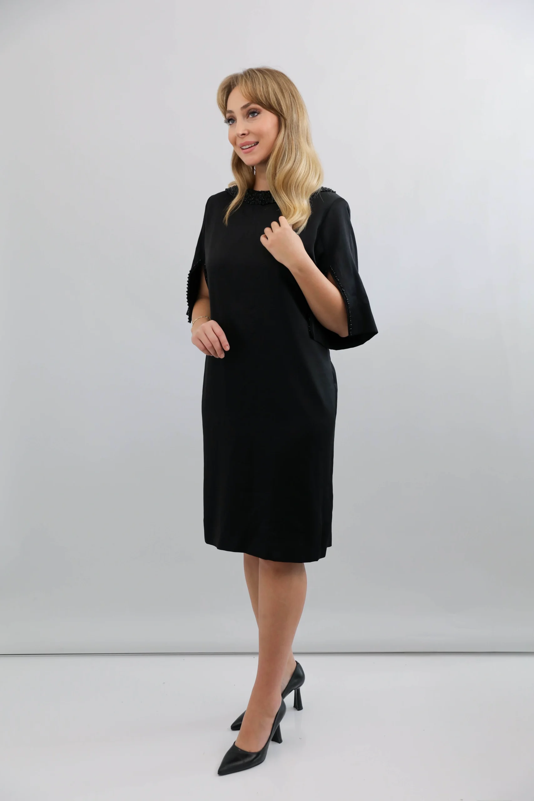Sade şıklığın zarafetle buluştuğu siyah boncuk detaylı kısa abiye elbise, modern kesimi ve şık işlemeleriyle özel günlerde göz alıcı bir görünüm sunar. Kol ve yaka kısmındaki el işçiliği boncuk detayları modeli ön plana çıkarırken, rahat kesimi hareket özgürlüğü sağlar. Davet, nişan, mezuniyet ve tüm özel organizasyonlar için ideal bir seçimdir.