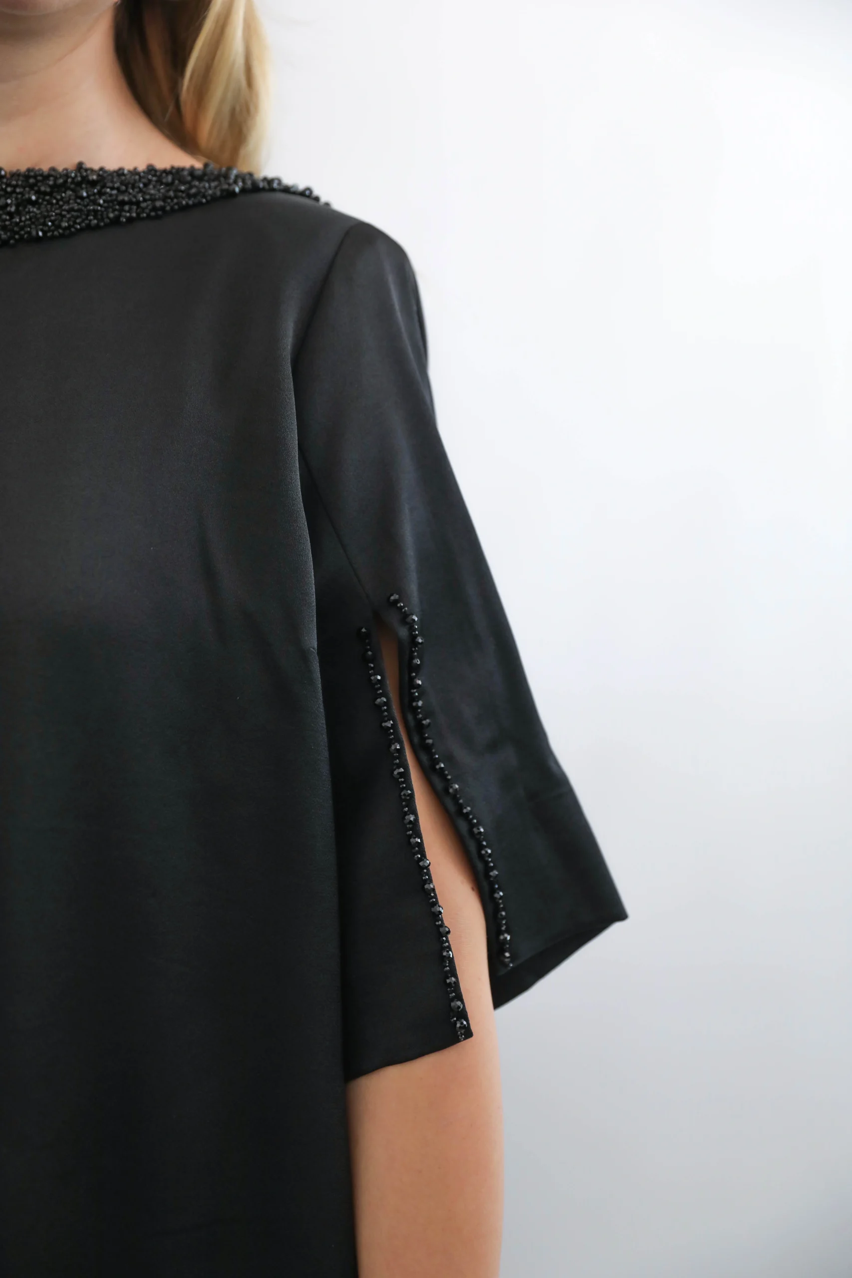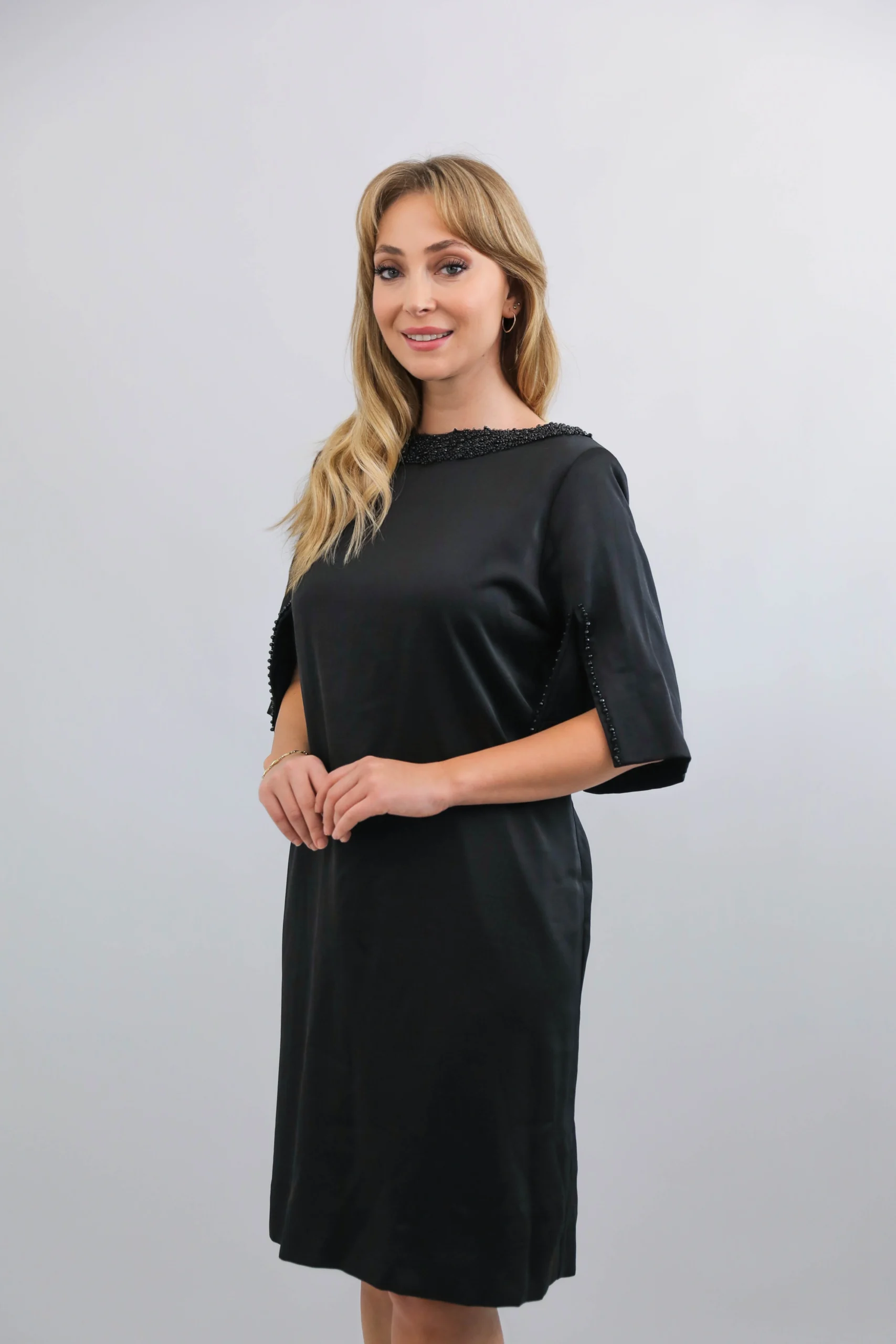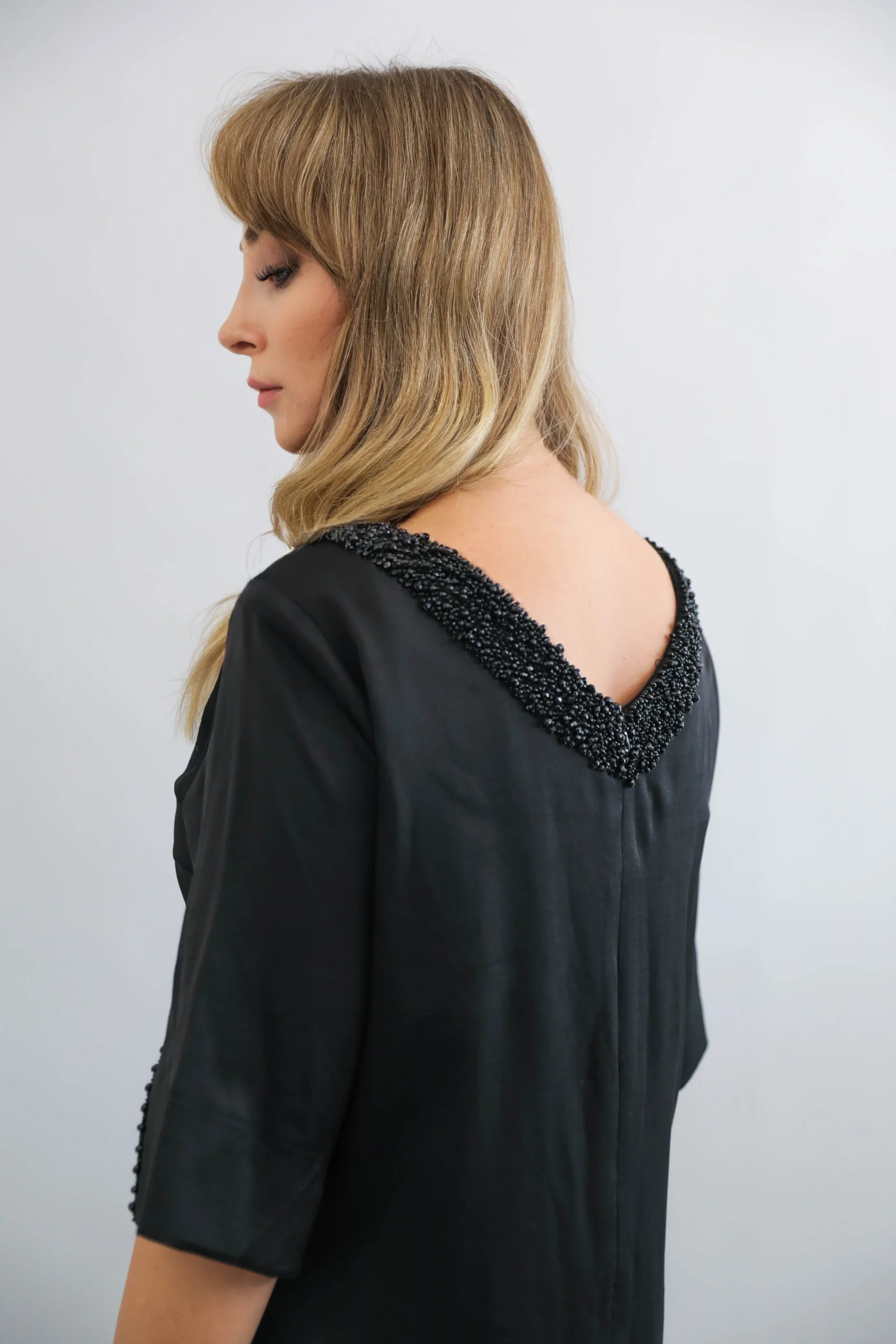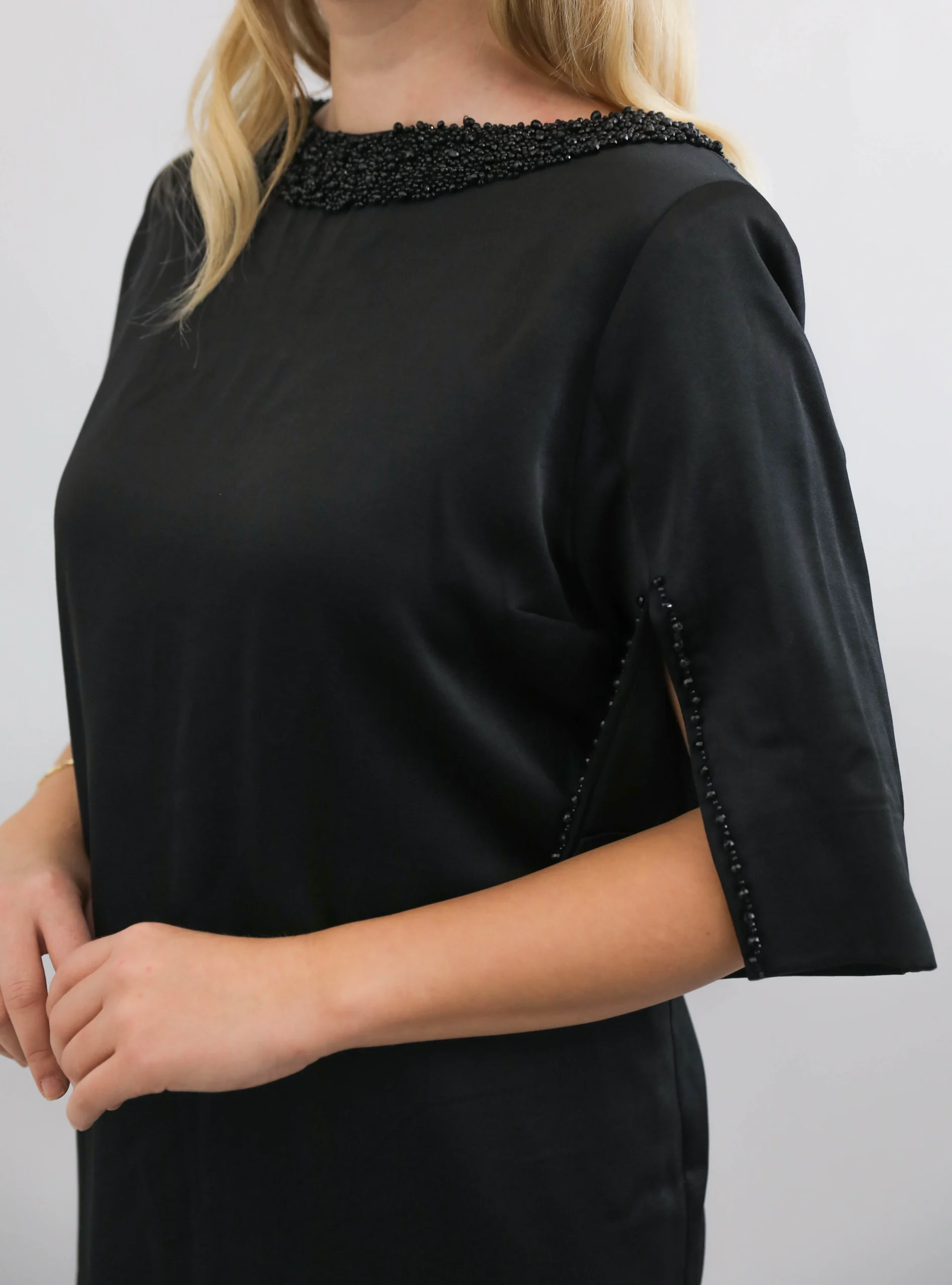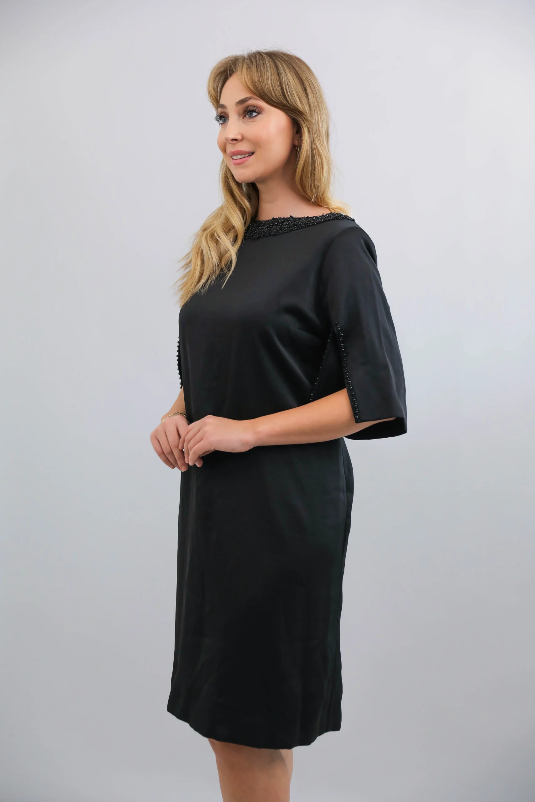 Sade şıklığın zarafetle buluştuğu siyah boncuk detaylı kısa abiye elbise, modern kesimi ve şık işlemeleriyle özel günlerde göz alıcı bir görünüm sunar. Kol ve yaka kısmındaki el işçiliği boncuk detayları modeli ön plana çıkarırken, rahat kesimi hareket özgürlüğü sağlar. Davet, nişan, mezuniyet ve tüm özel organizasyonlar için ideal bir seçimdir.