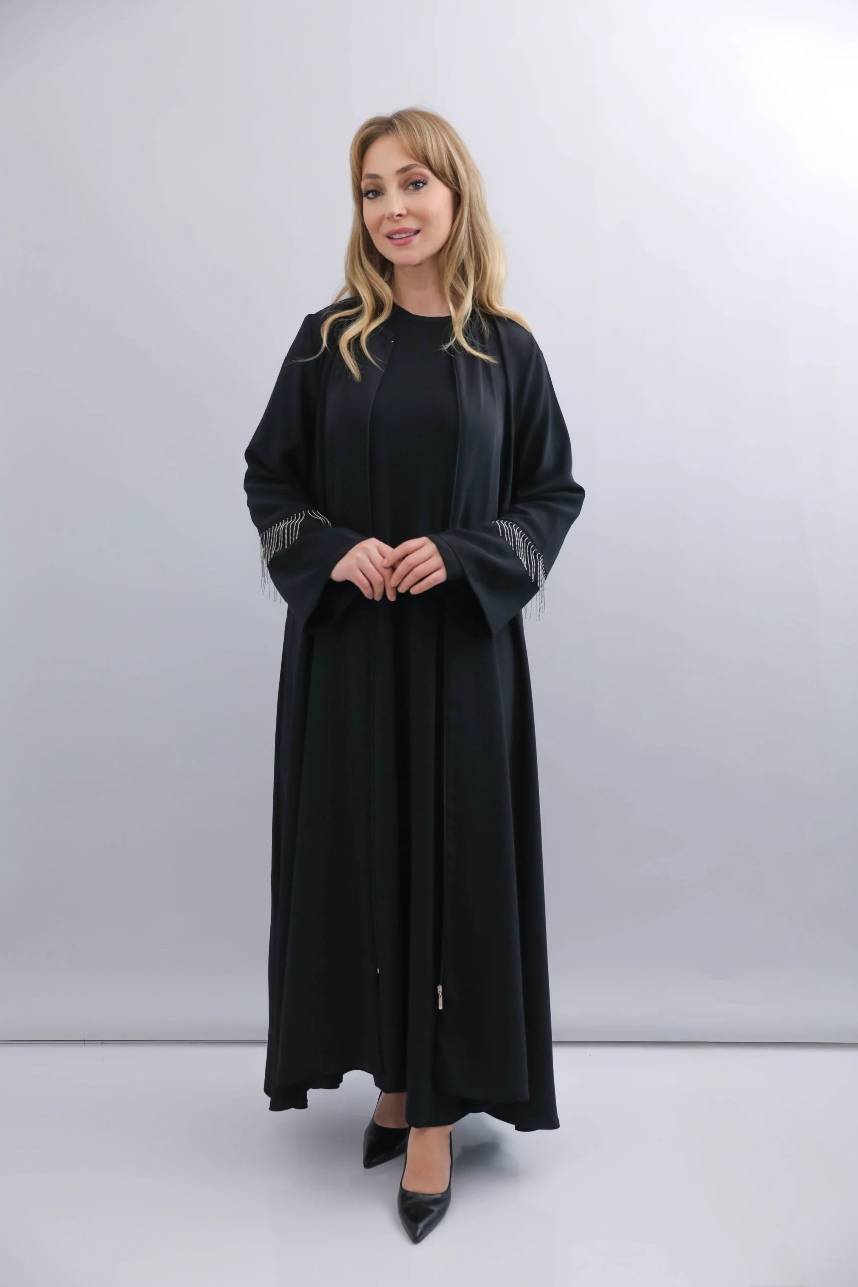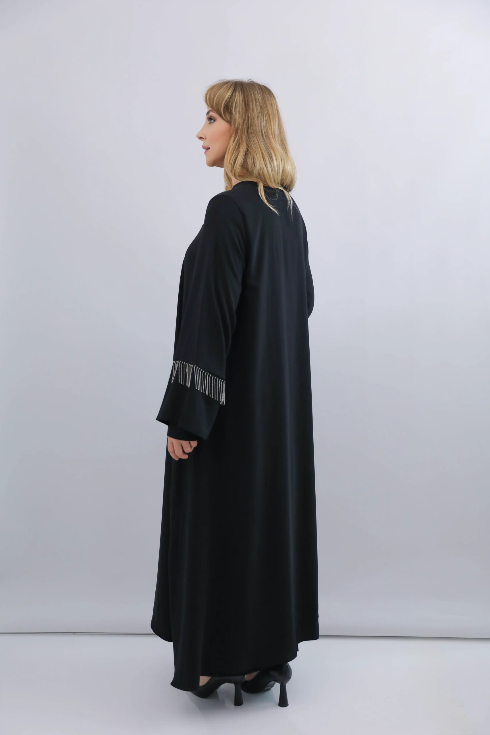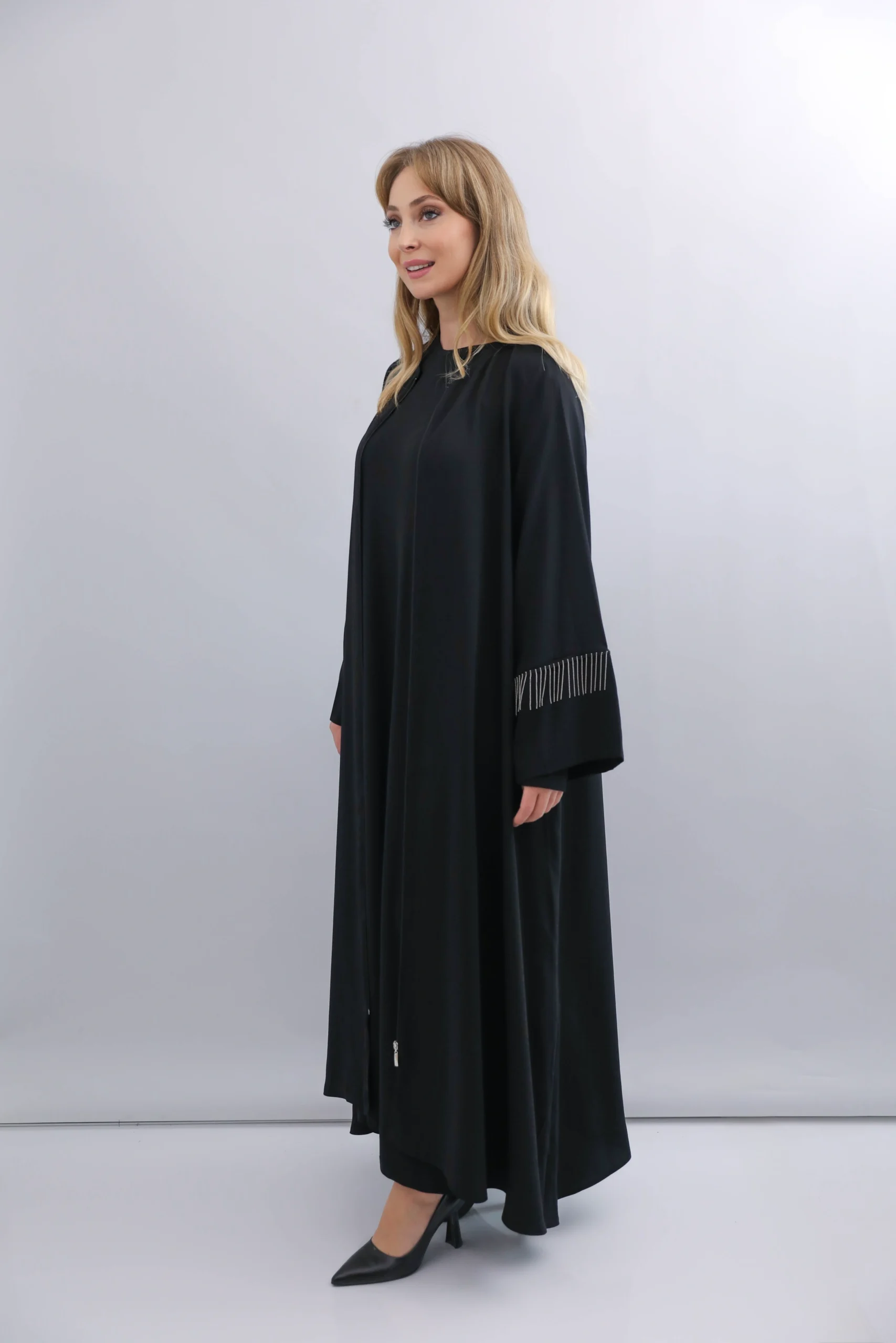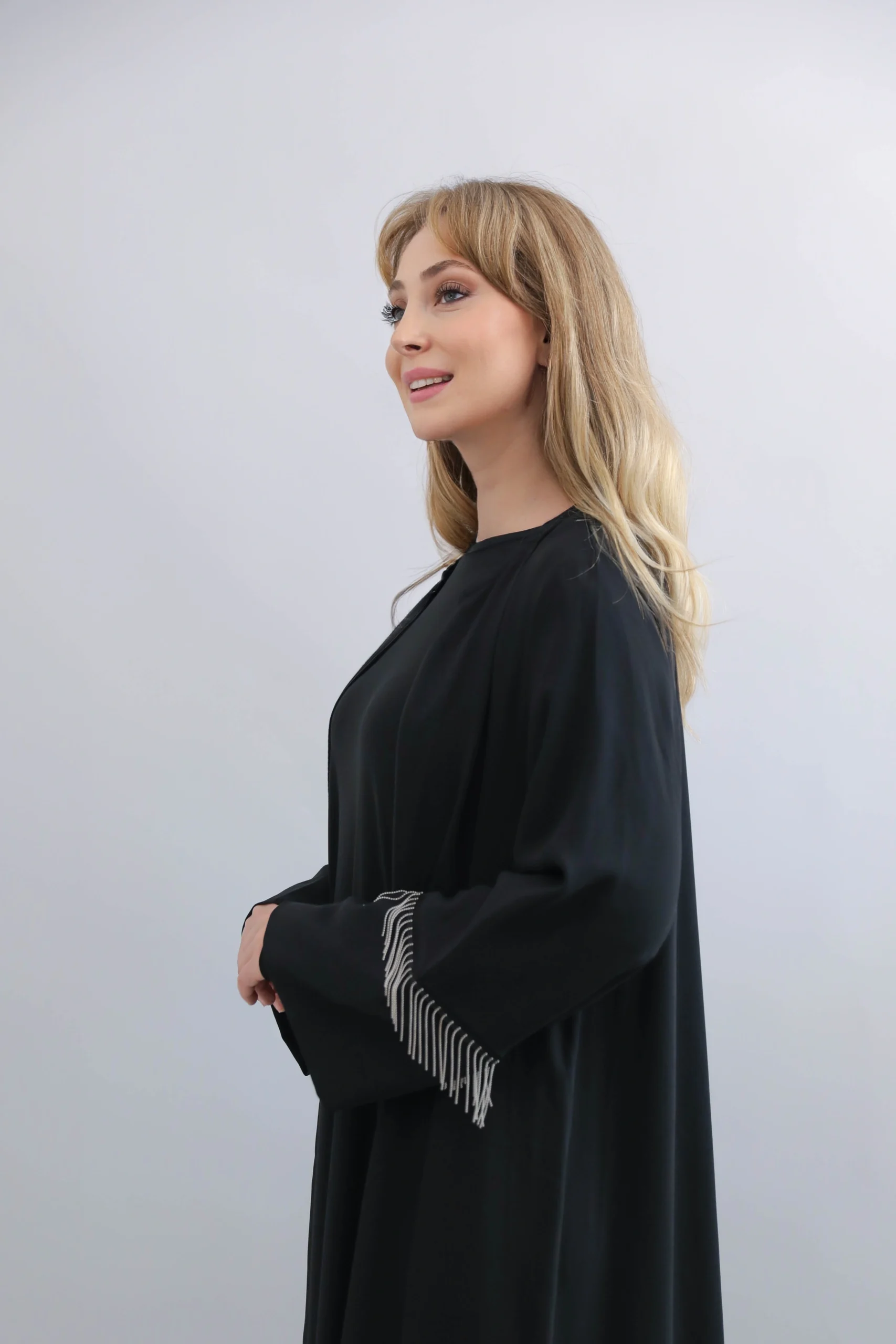 Siyah İnce İşlemeli Kolluk Detaylı Ferace, sade şıklığı zarif dokunuşlarla bir araya getiren özel bir tasarımdır. Geniş kesimi sayesinde rahat kullanım sunarken, kol manşetlerindeki ince taş işlemeli püskül detayları feraceye modern ve göz alıcı bir hava katar.