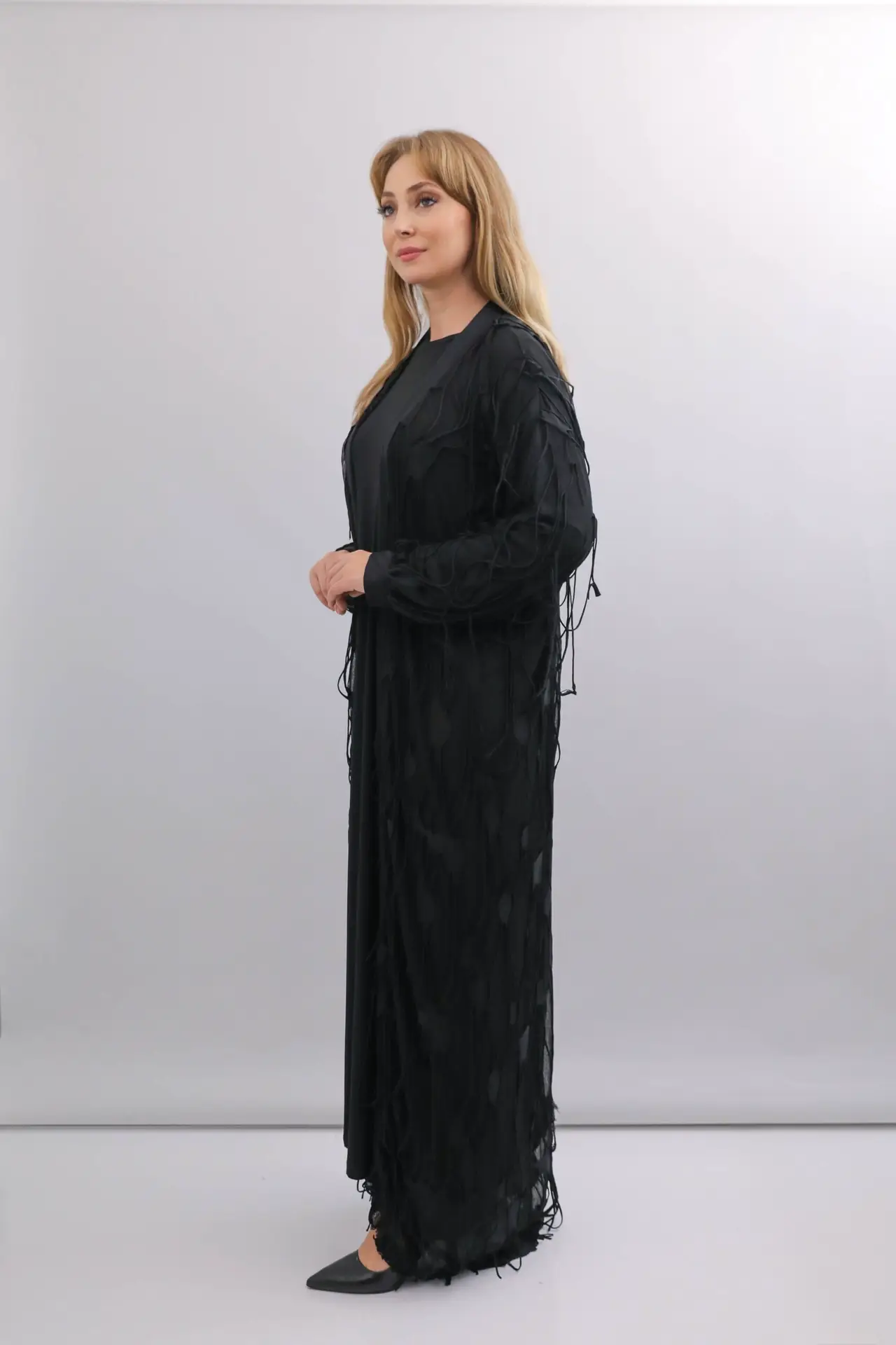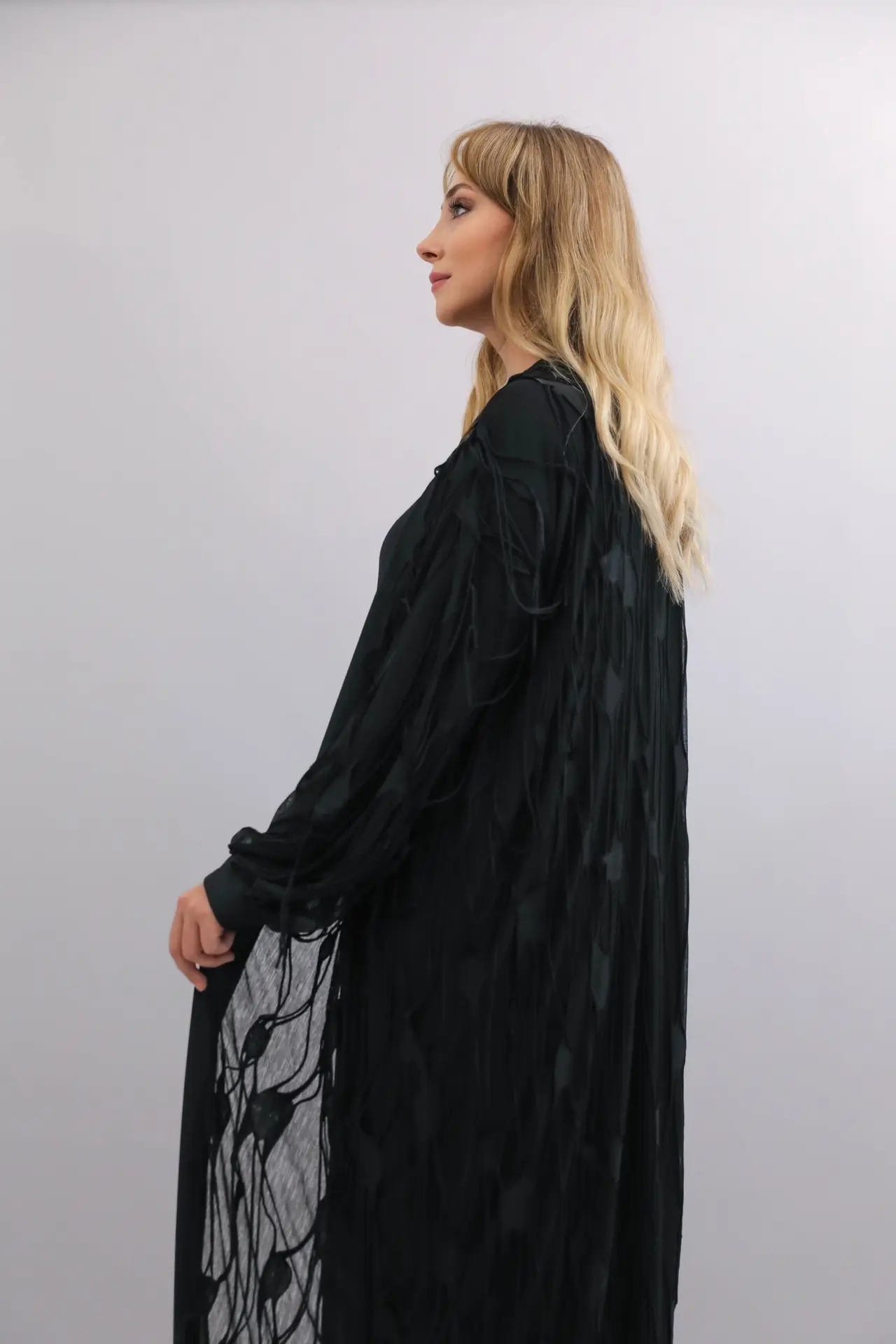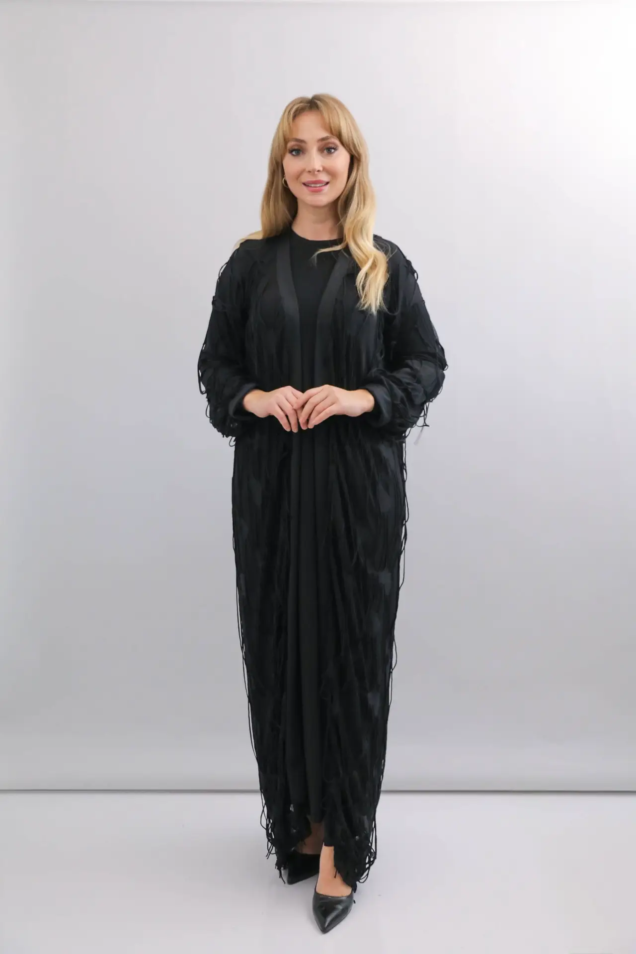 Zarif tasarımı ve özel tüylü detaylarıyla dikkat çeken siyah abaya kap modeli, şıklığınızı tamamlayan hafif ve dökümlü yapısıyla hem günlük hem özel davet kombinlerinde ideal bir görünüm sunar.