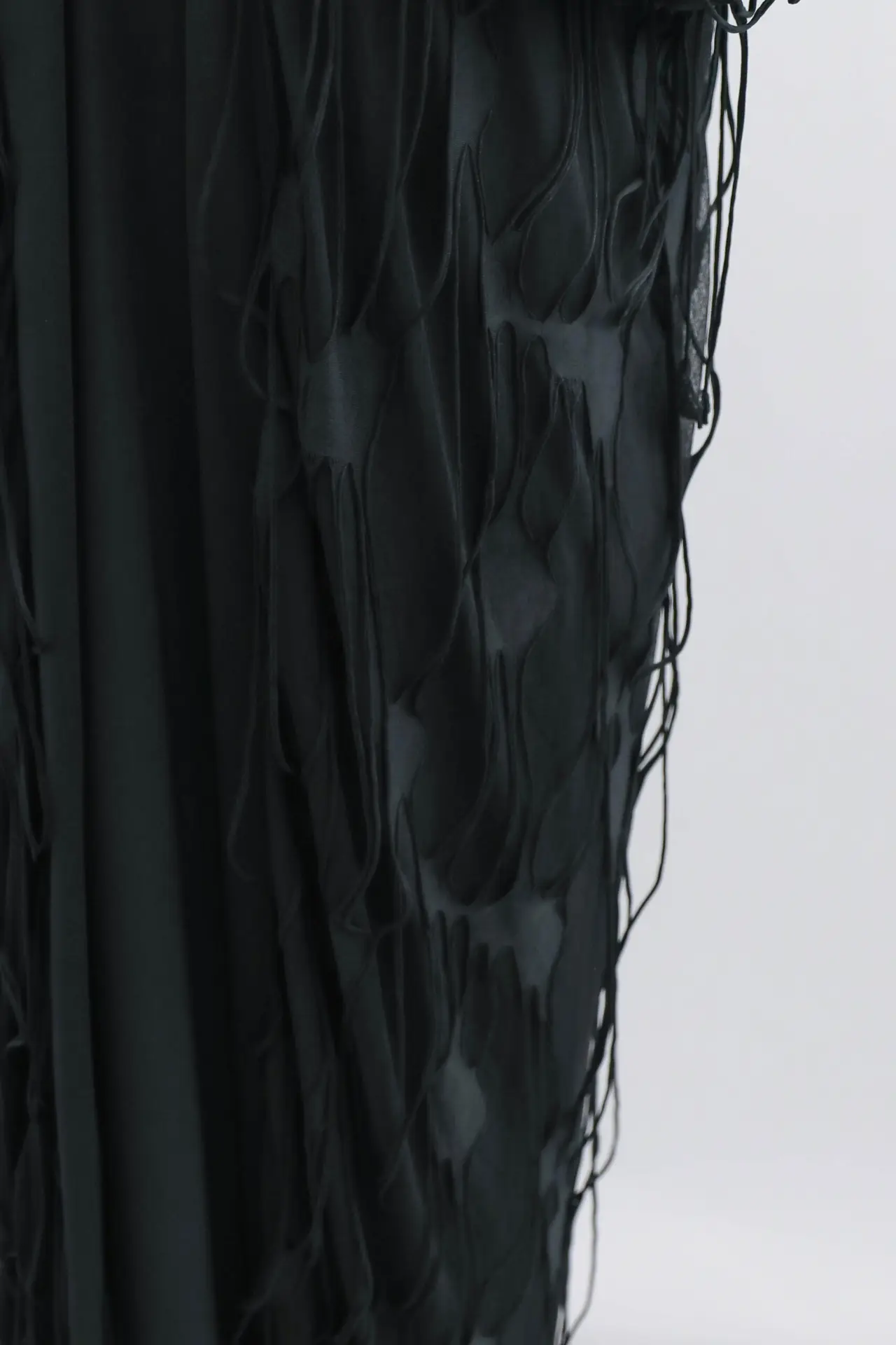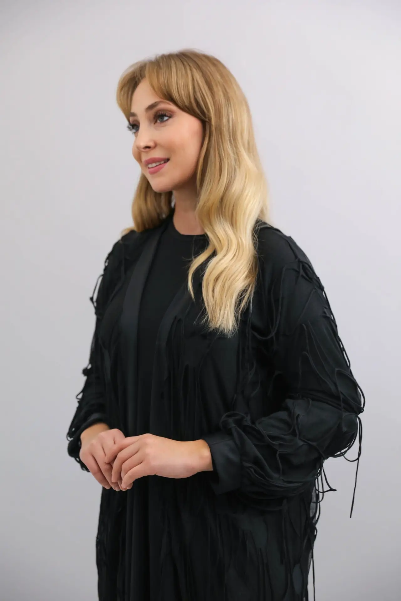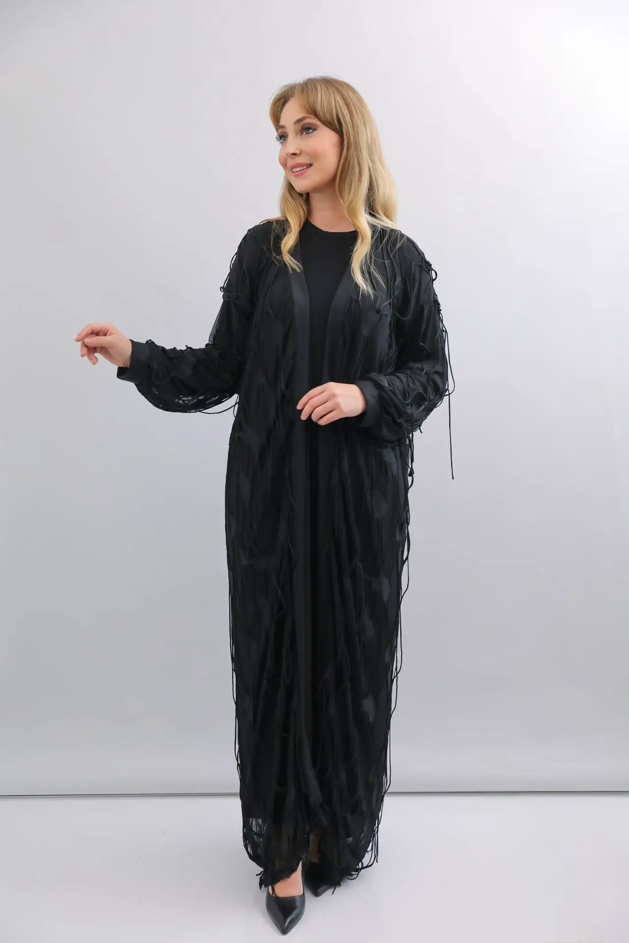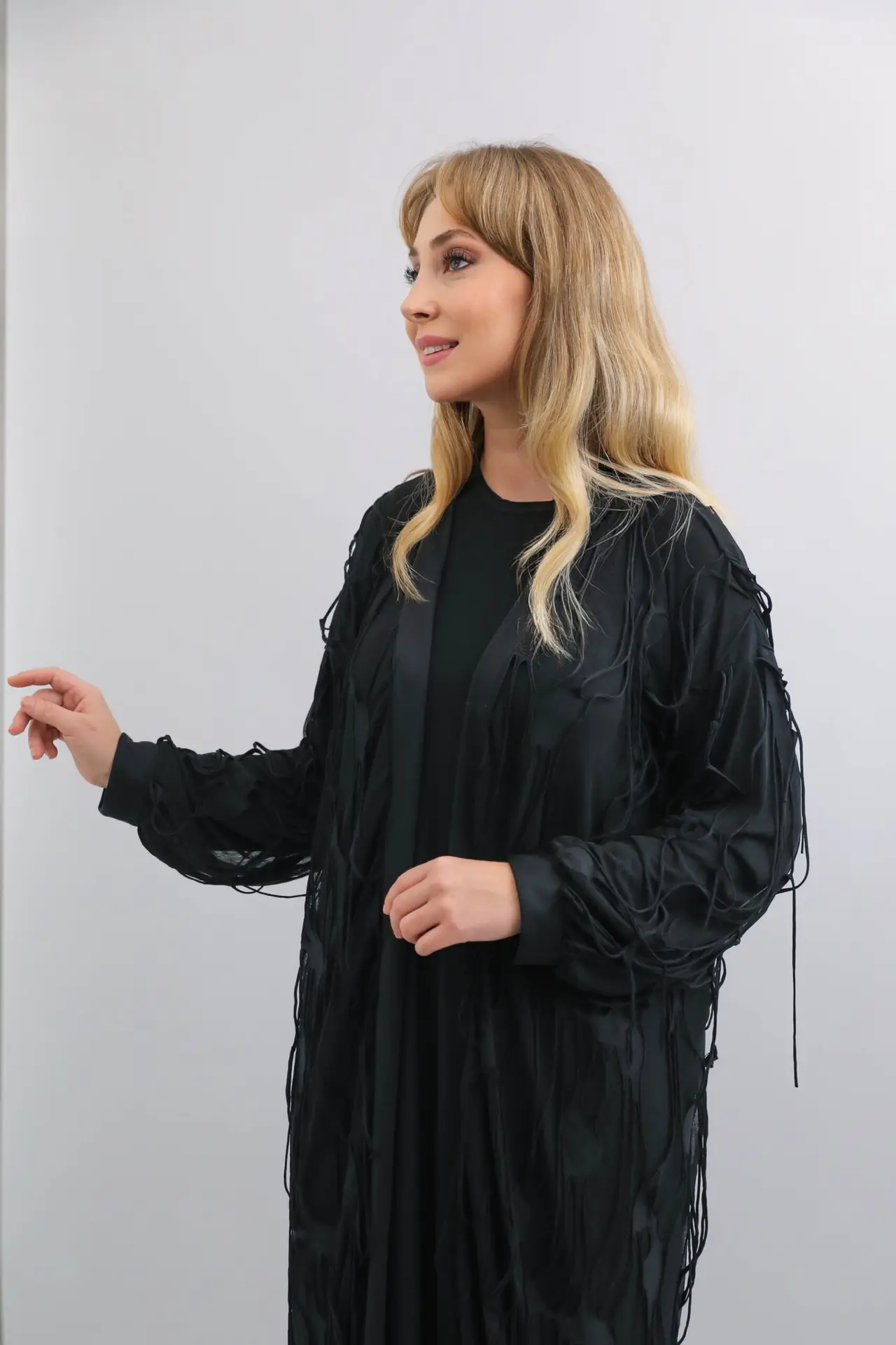 Zarif tasarımı ve özel tüylü detaylarıyla dikkat çeken siyah abaya kap modeli, şıklığınızı tamamlayan hafif ve dökümlü yapısıyla hem günlük hem özel davet kombinlerinde ideal bir görünüm sunar.