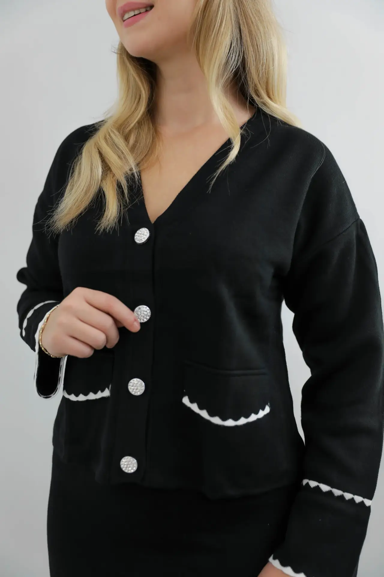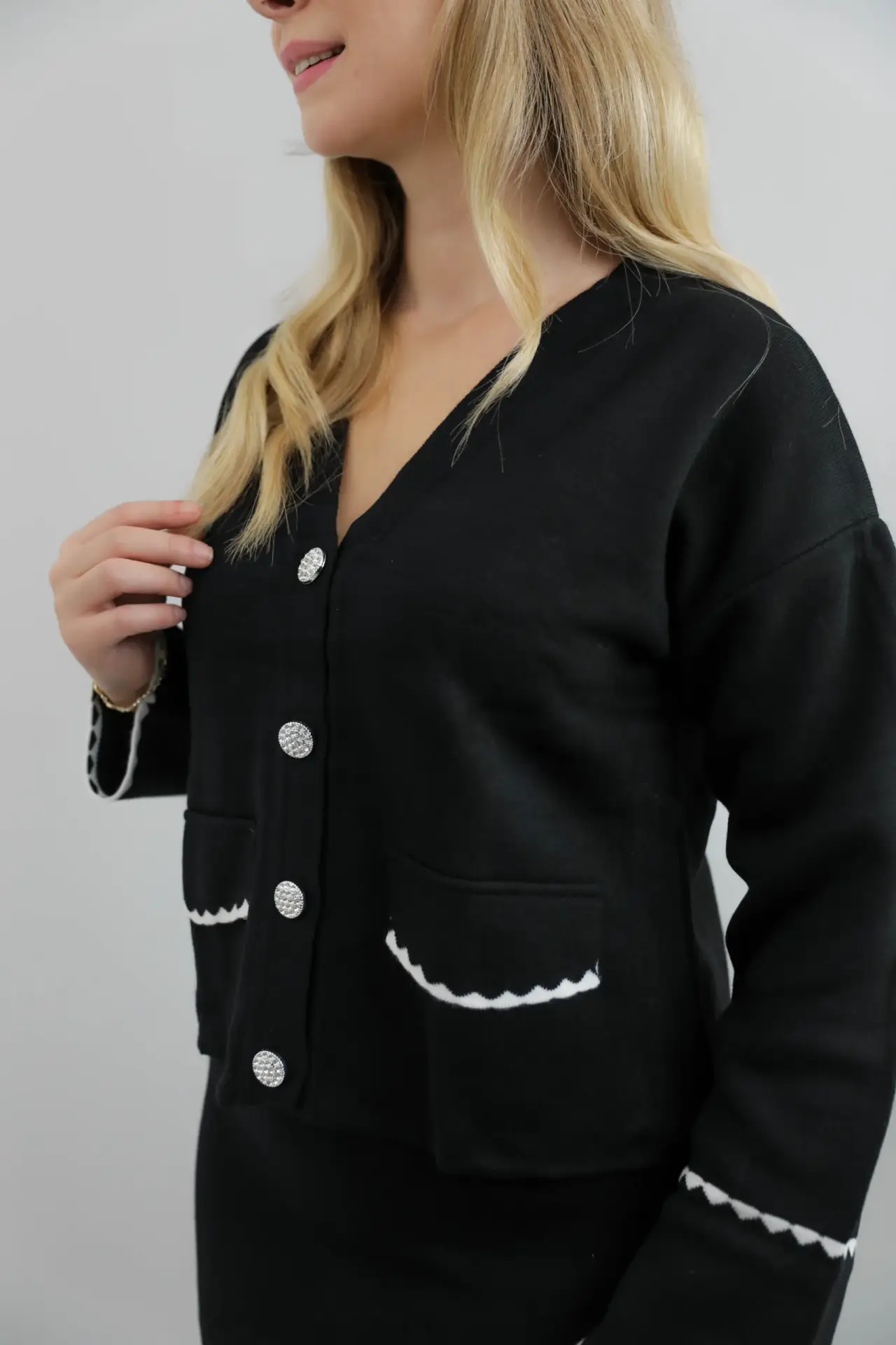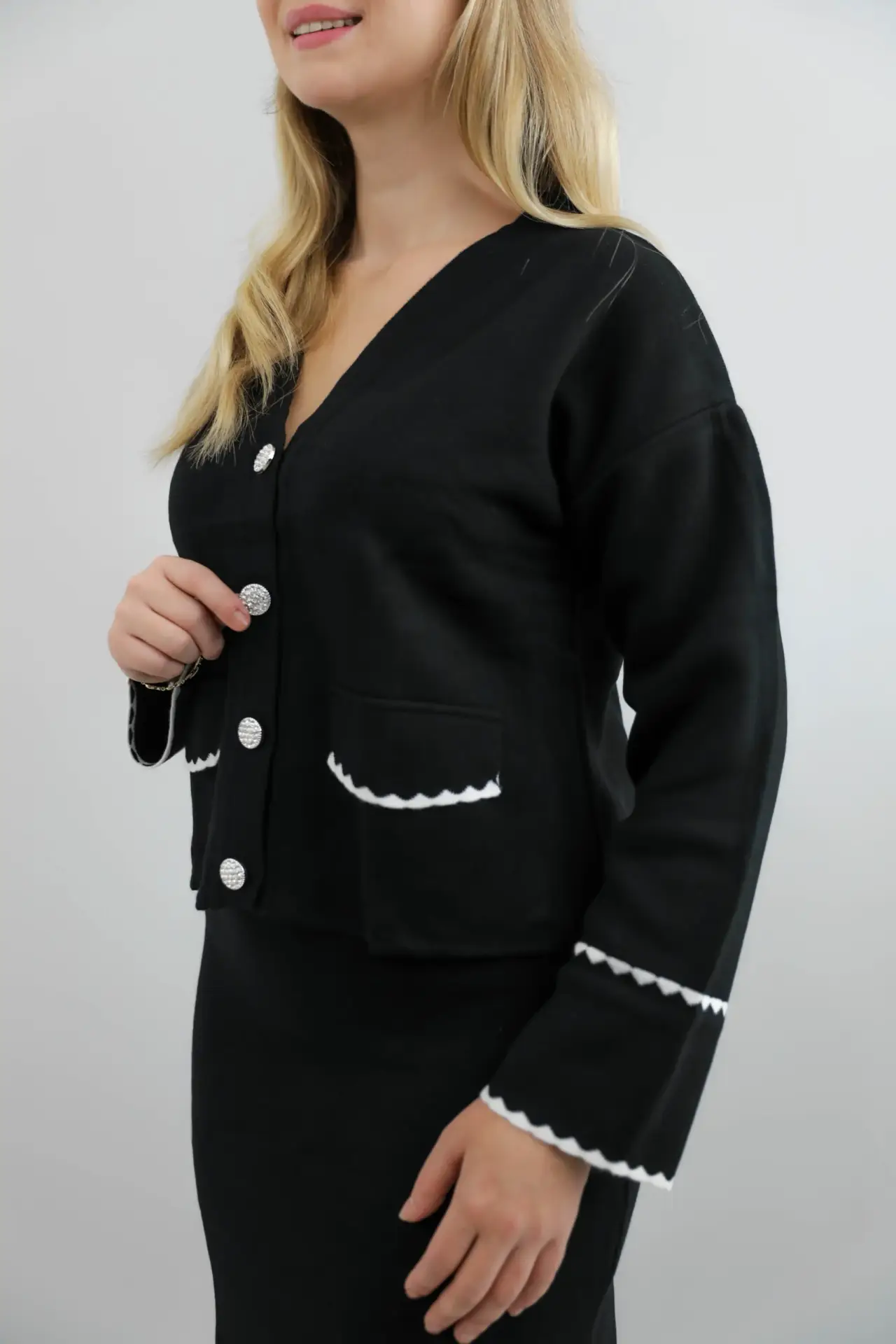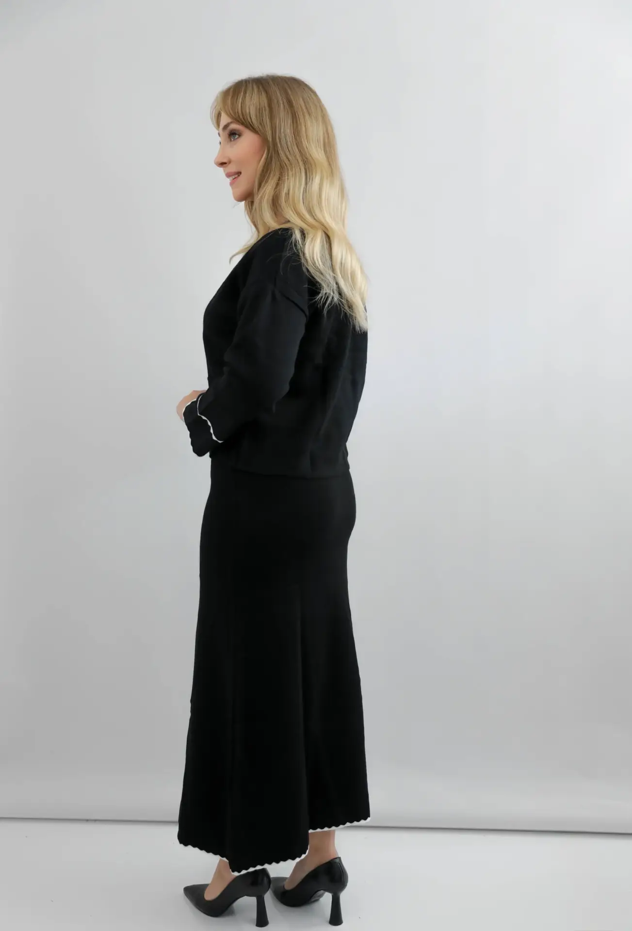 Minimal şıklığın en zarif hâli! İnci düğme detaylı üst ve uzun siyah etekten oluşan bu ikili takım; hem konforlu hem de son derece şık bir görünüm sunar. Günlük stilinizden özel davetlere kadar her ortamda dikkat çeken, zamansız bir tasarım.