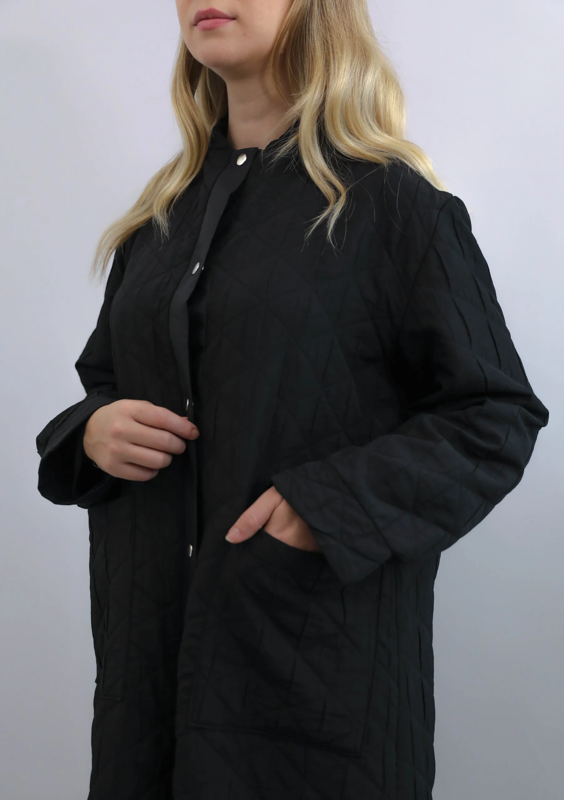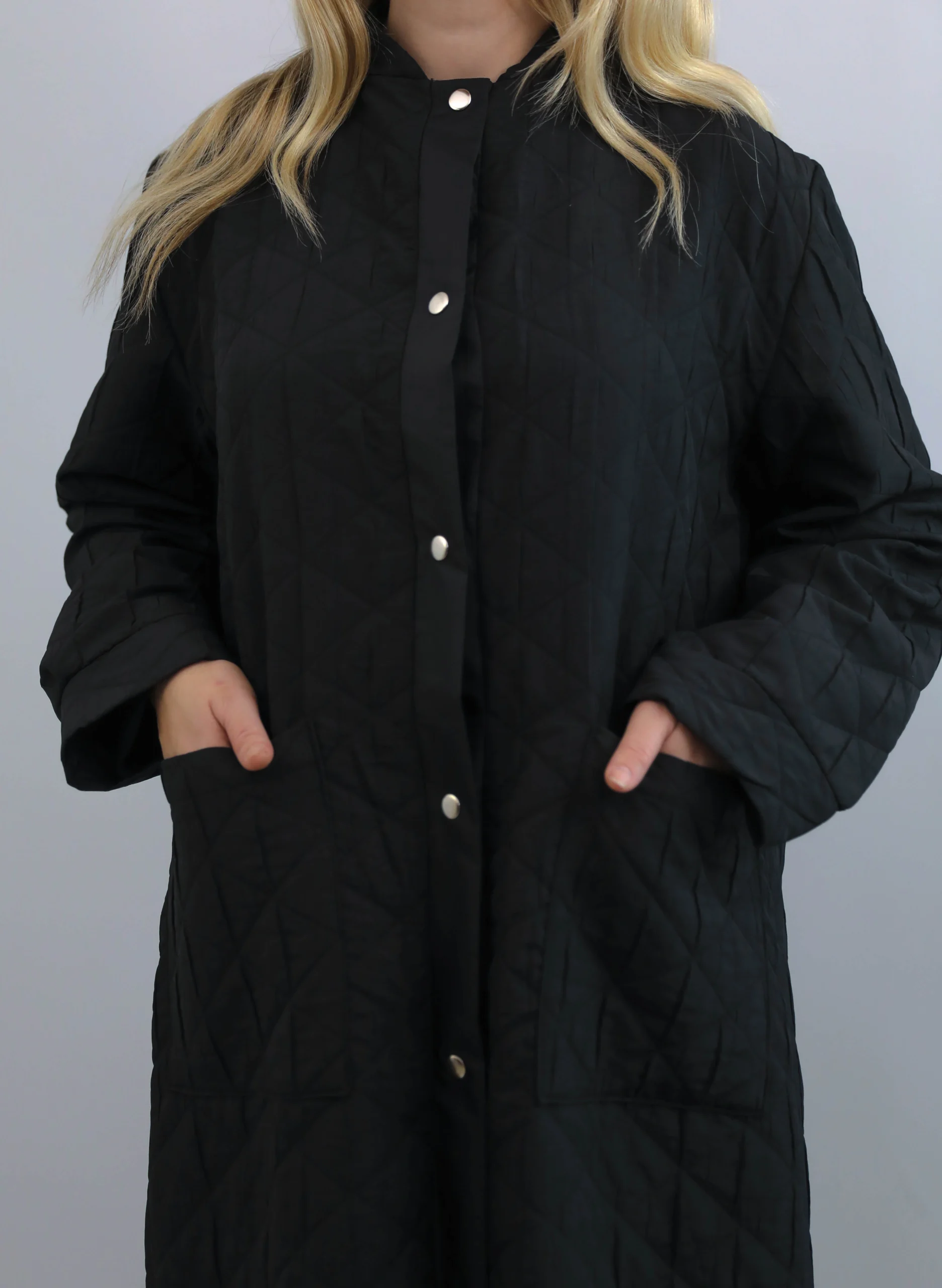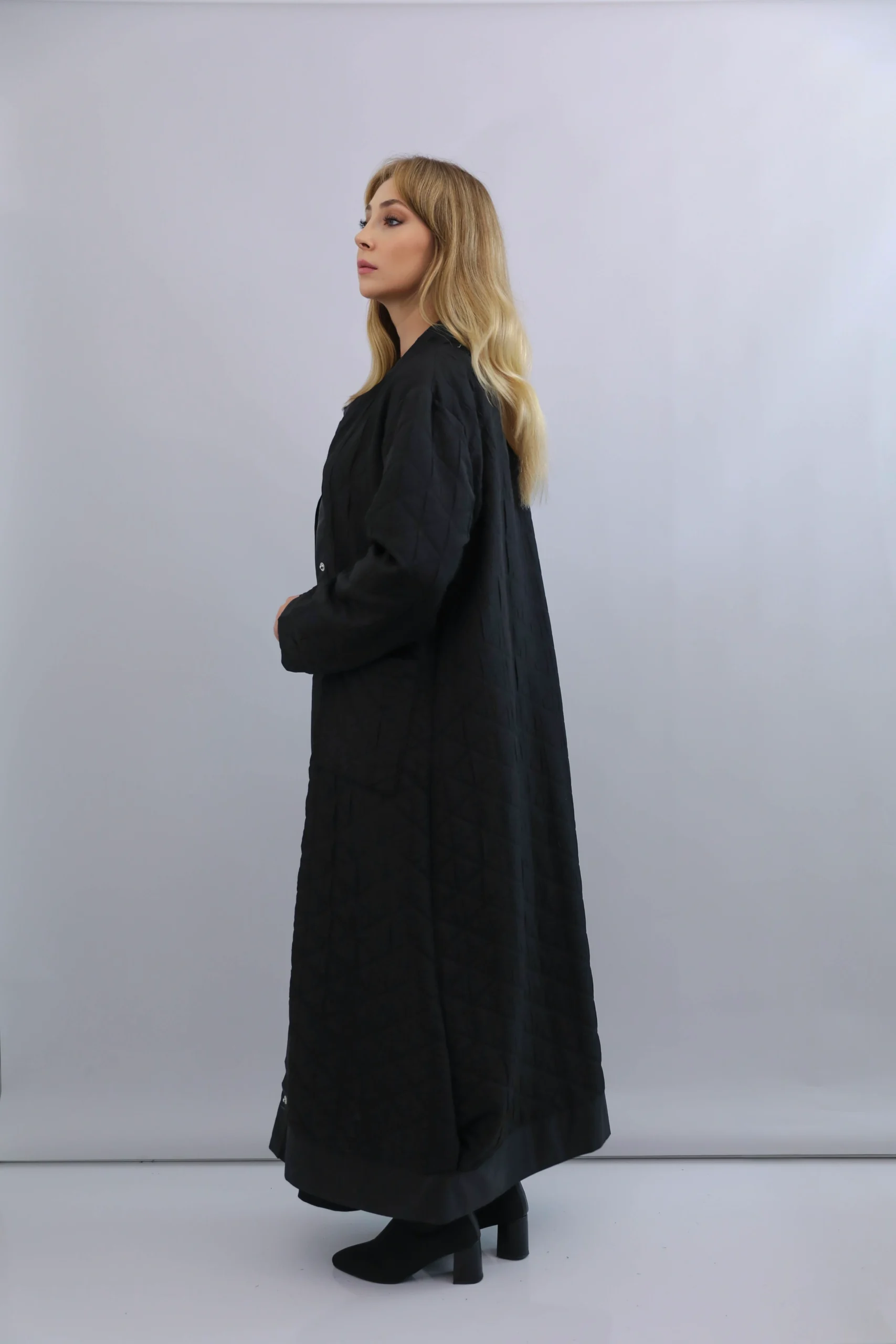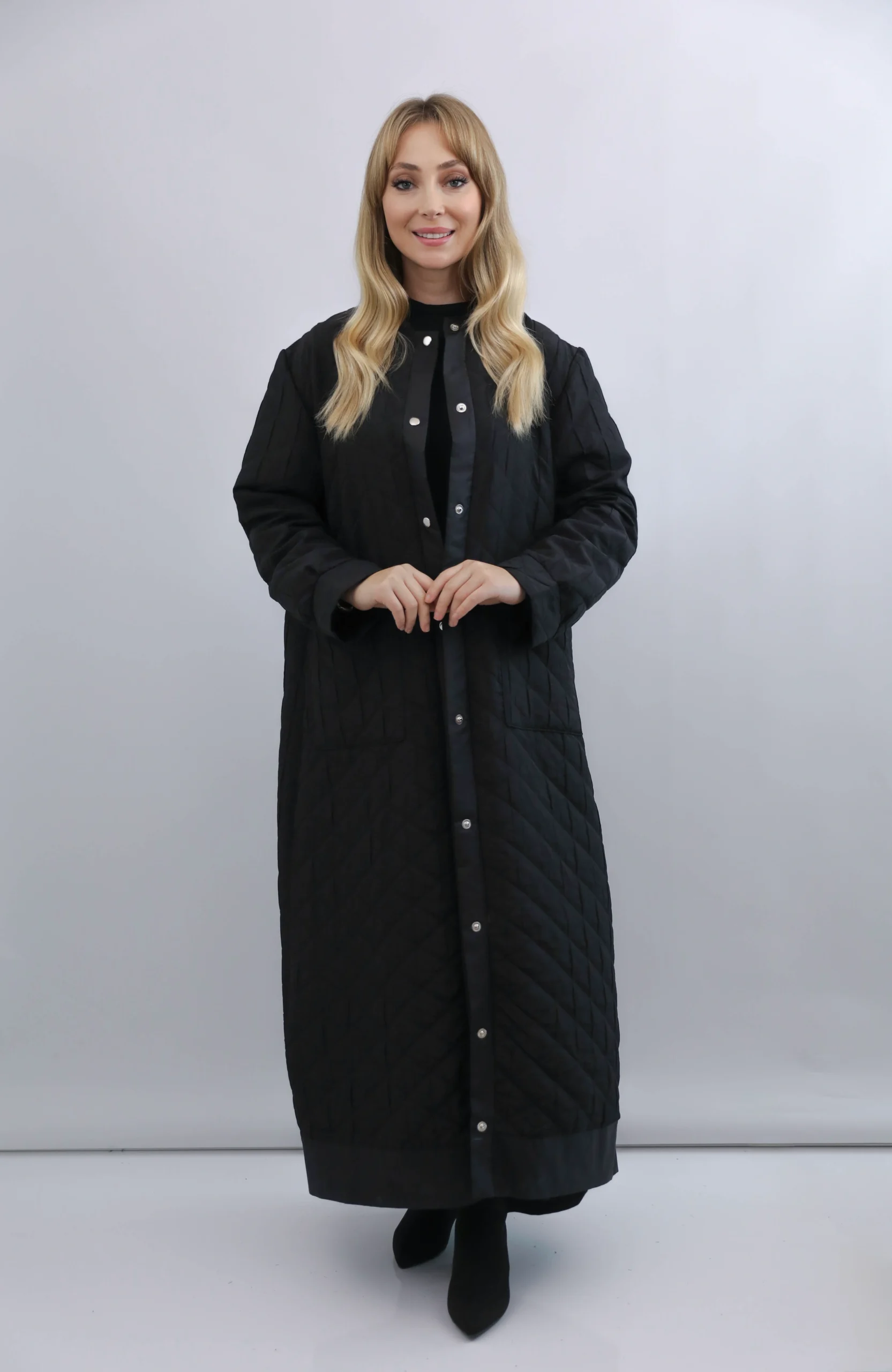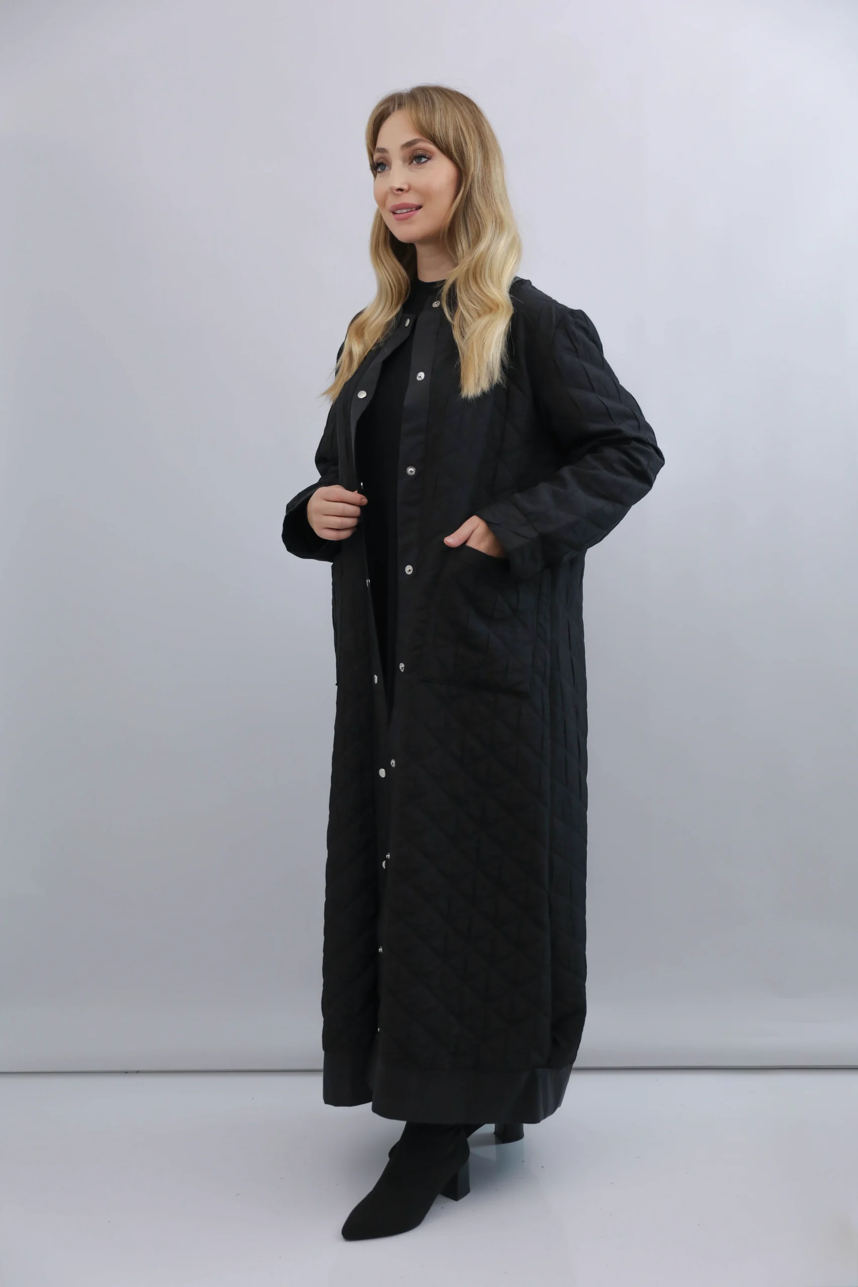 Kapitone dokusu sayesinde hem sıcak tutan hem de modern bir görünüm sunan bu uzun siyah kap, tesettür dış giyimde zamansız bir parça arayanlar için ideal bir seçimdir. Rahat kesimi ve pratik çıtçıtlı kapanışı ile günlük kullanımda konfor sağlarken, minimalist tasarımı ile her kombine kolaylıkla uyum sağlar.