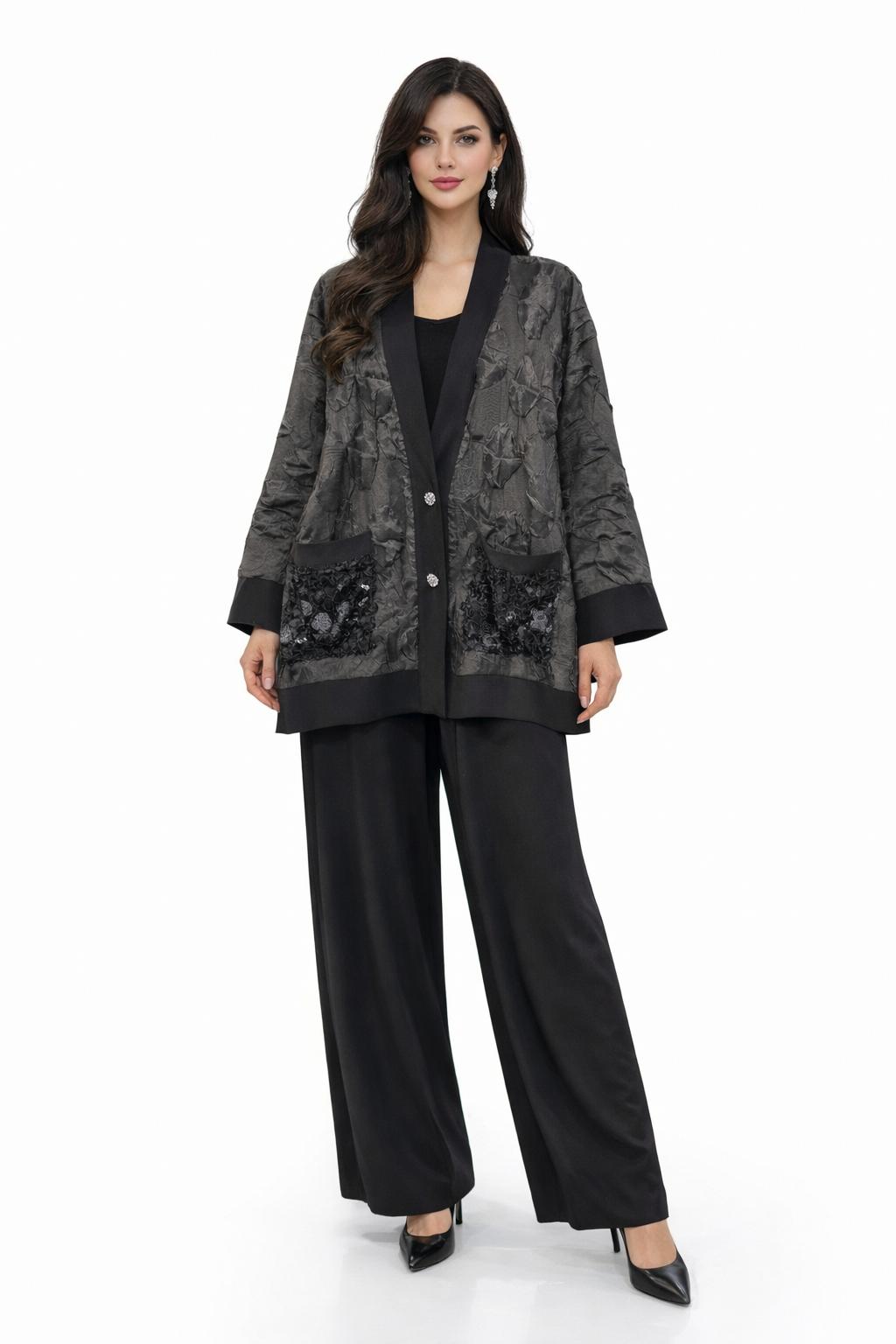Şıklığı ve rahatlığı bir araya getiren bu özel tasarım kombin; ceket, iç bluz ve pantolondan oluşan uyumlu parçalarıyla zarif bir stil sunar. Desenli ve dokulu ceket tasarımı kombine modern bir görünüm kazandırırken, pantolonun rahat kesimi gün boyu konfor sağlar.